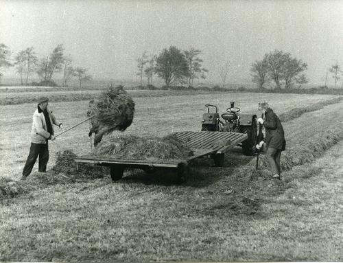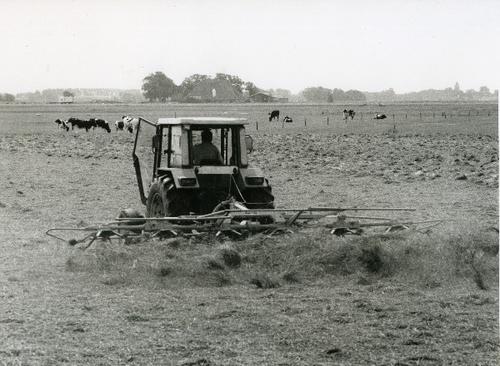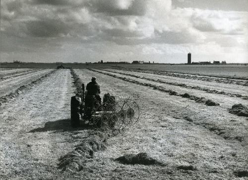 Foto in zwart-wit van een hooiland met een opsleepwa...