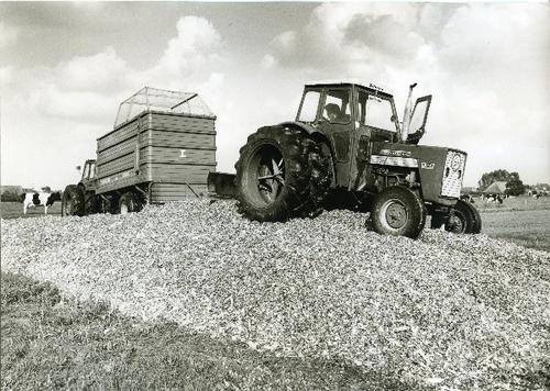 Foto in zwart-wit van een tractor voor een opraapwag...