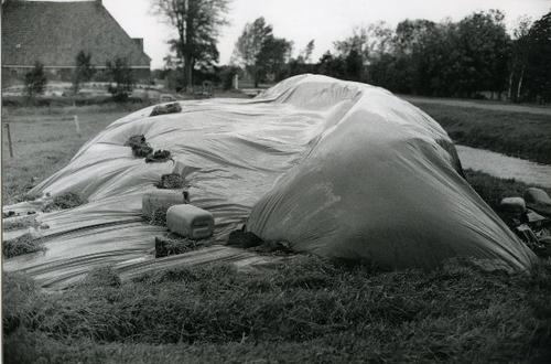 Foto in zwart-wit van een kuilbult onder folie door ...
