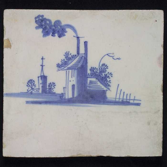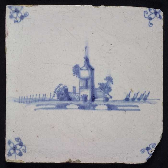 Tafereeltegel, blauw, huis met toren, hoekmotief spin