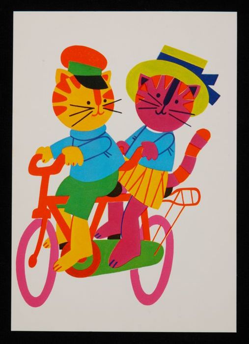 Prentbriefkaart voor het kind: twee poezen op fiets