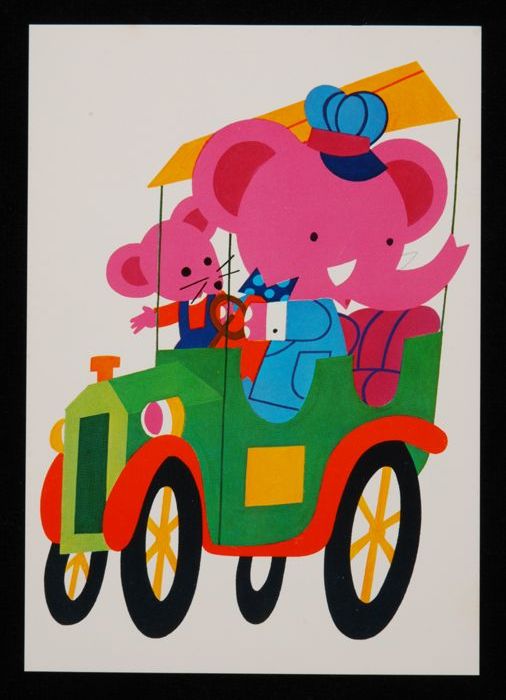Prentbriefkaart voor het kind: muis en olifant in auto