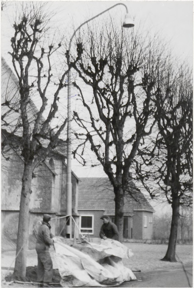 Mannen aan het werk bij lantaarnpaal voor boerderij