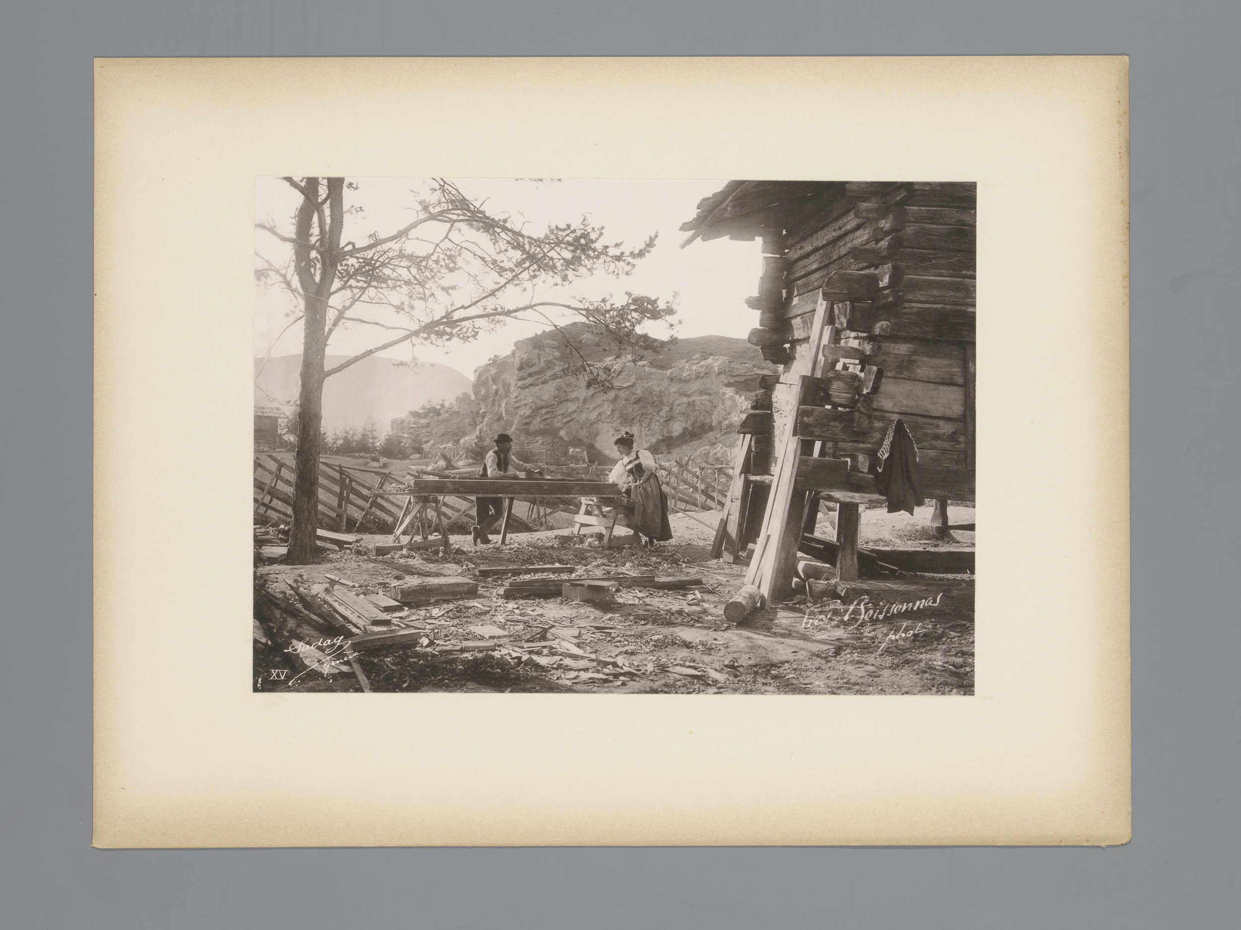 Gezicht op een vrouw en een man aan een zaagtafel in...