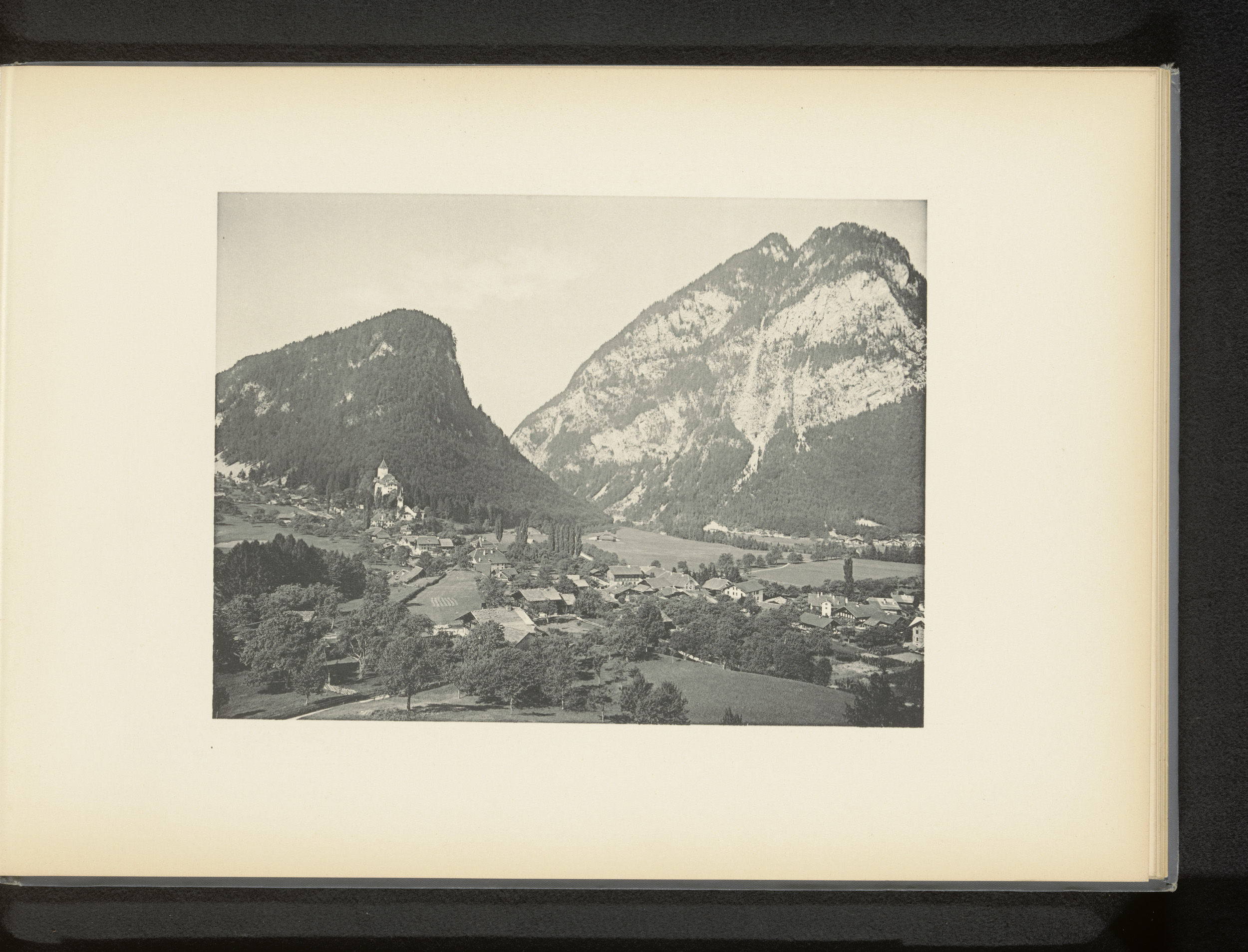 Gezicht op een dorpsplein met kerk te Zwitserland