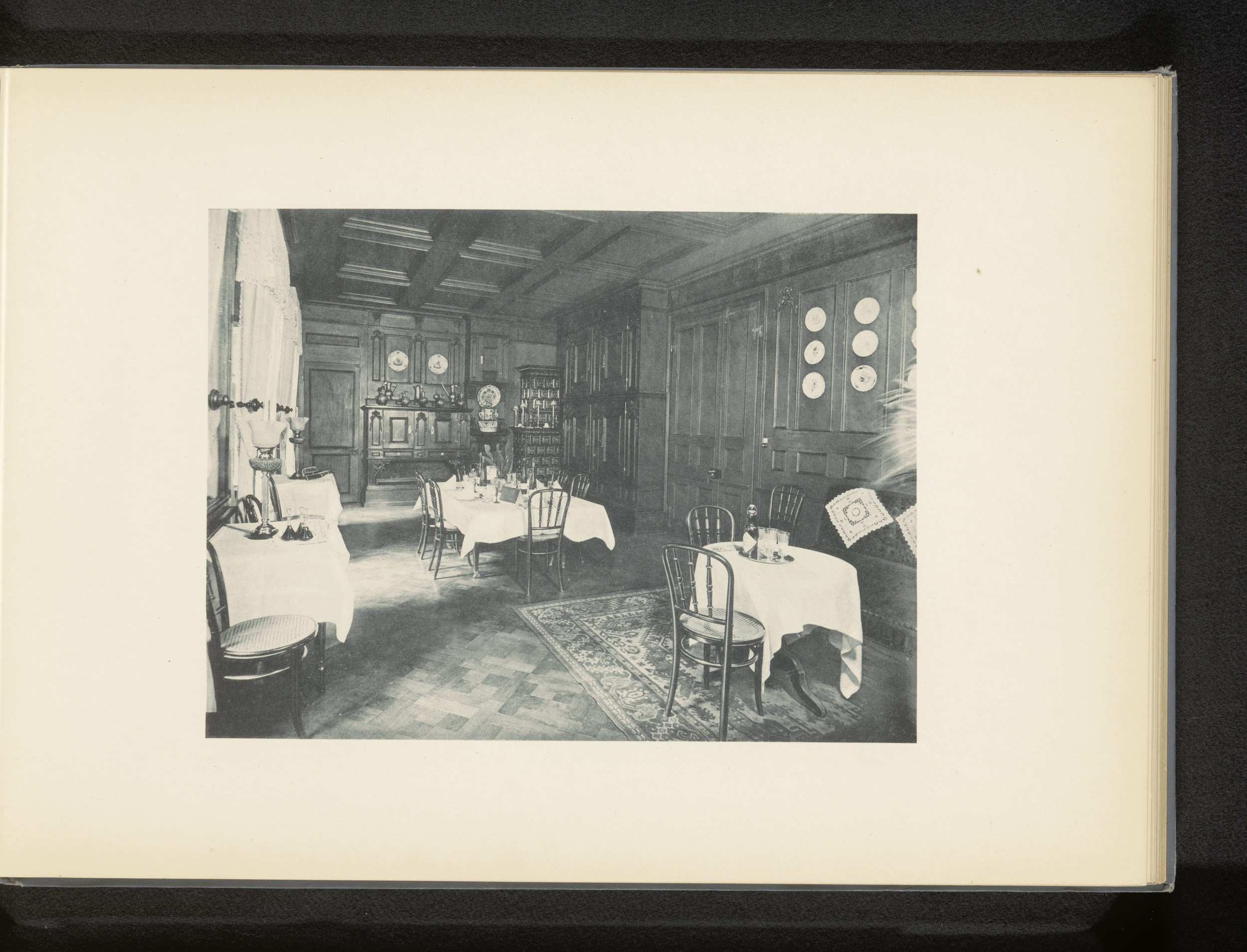 Gezicht op de eetzaal van het hoofdgebouw van de bad...