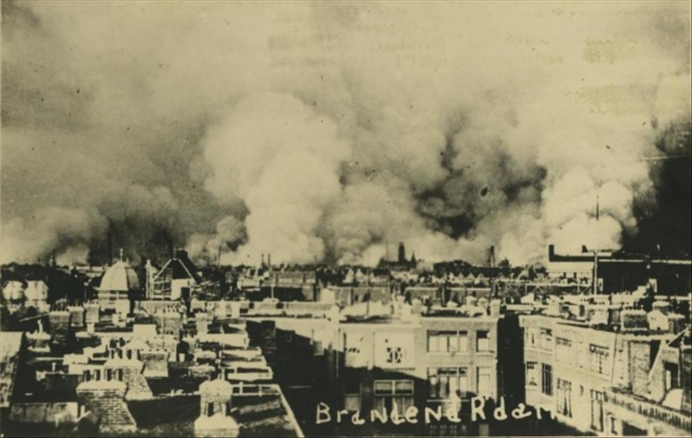 rijen huizen met er achter rook. Tekst: "Brandend R'...