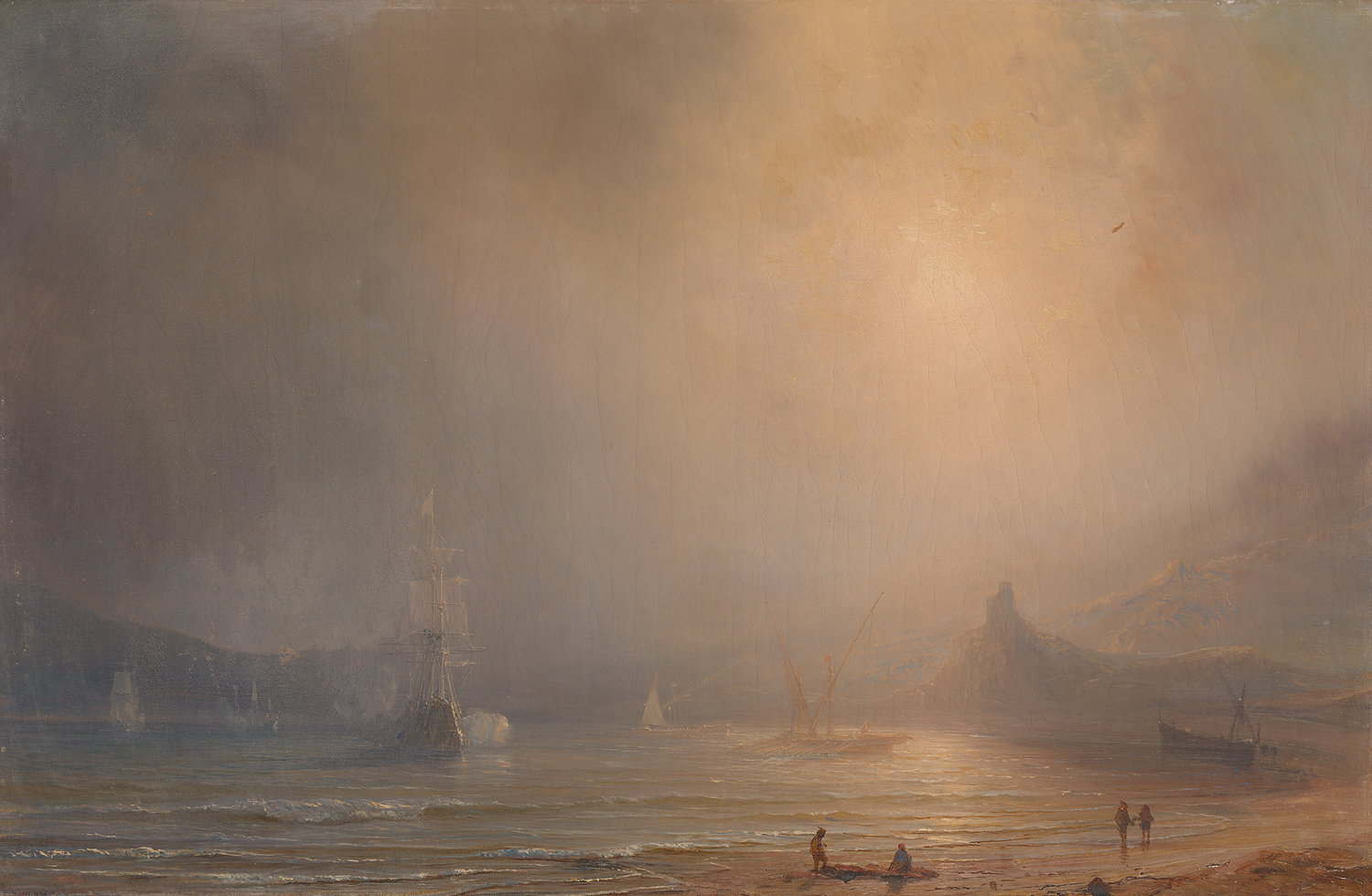 Voor anker liggende vissersschepen bij een strand