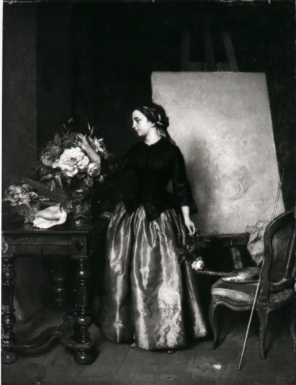 "Een meisje, bloemen in eene kan schikkende"