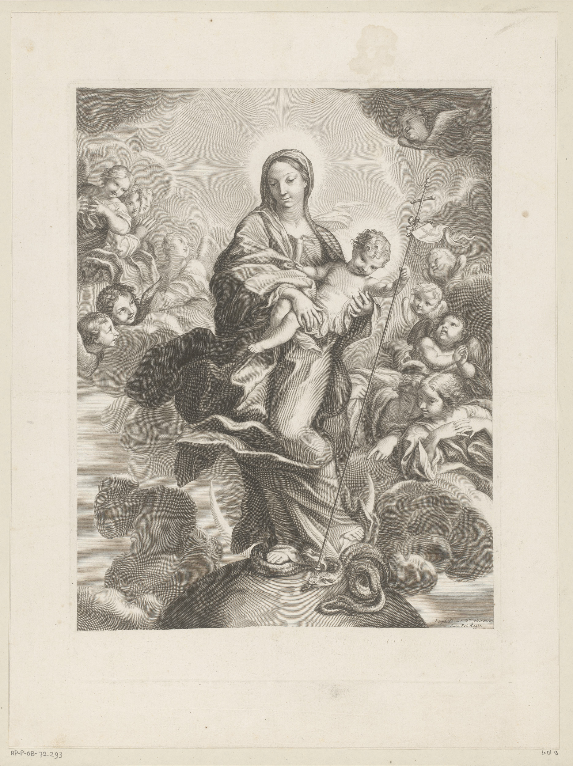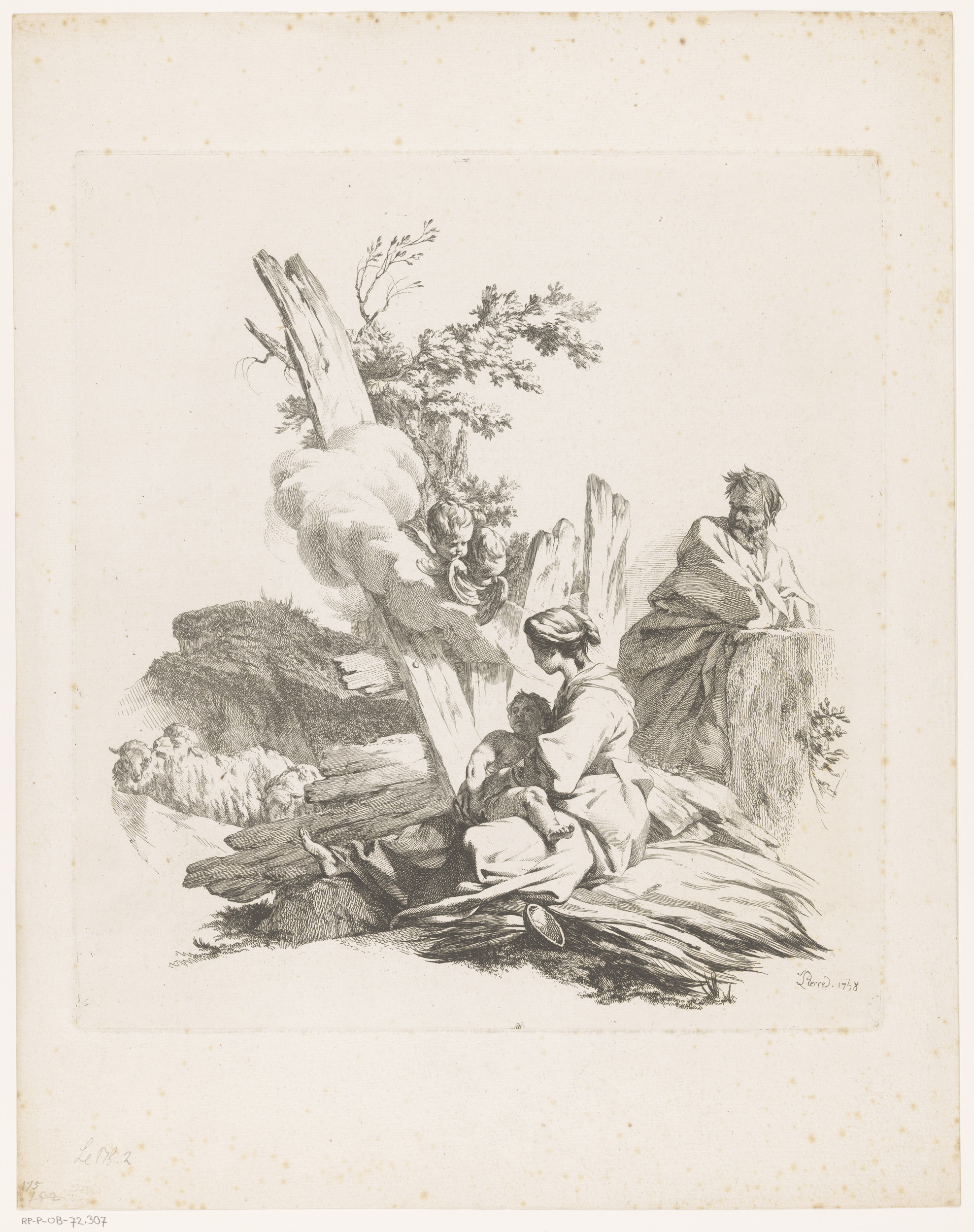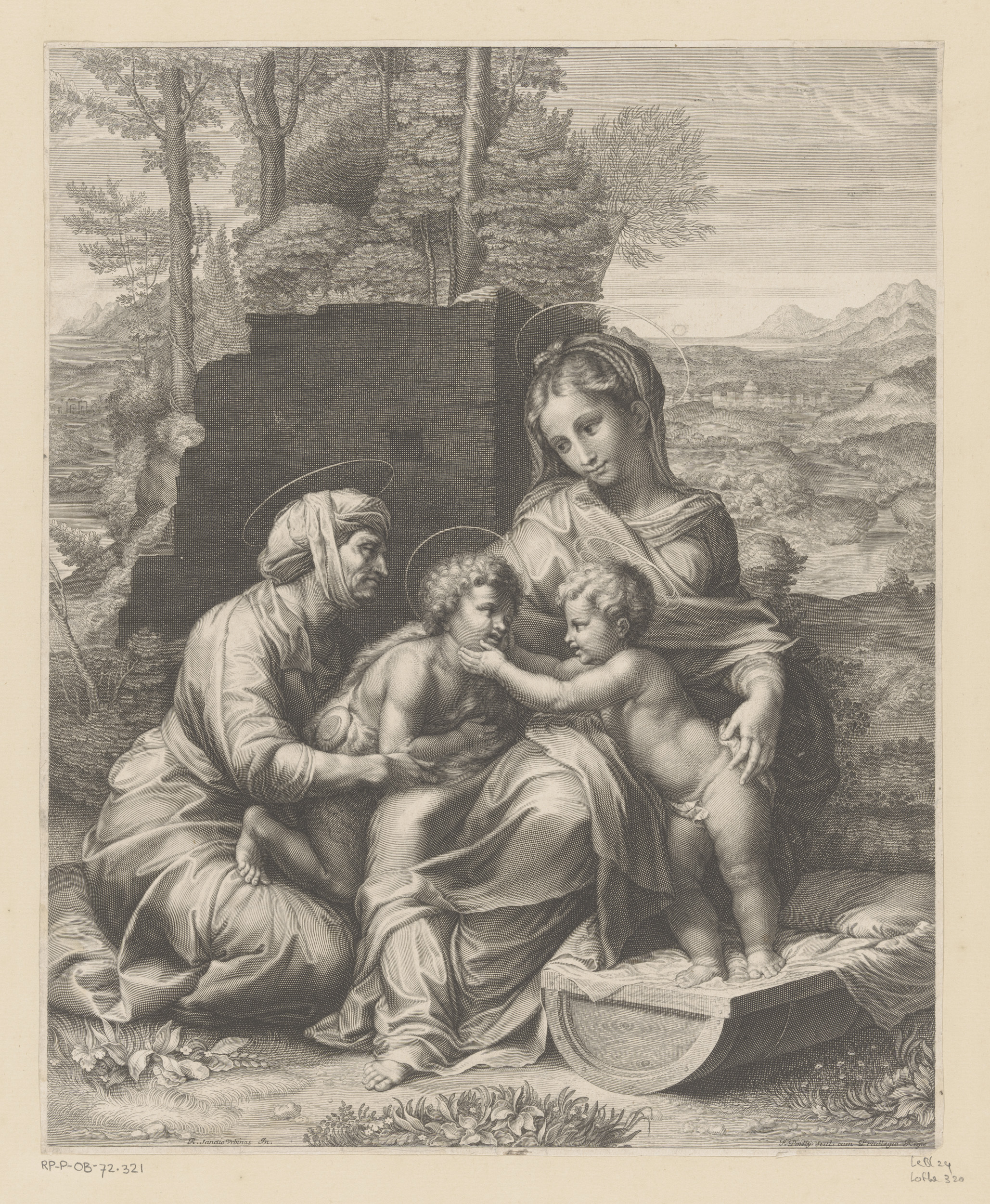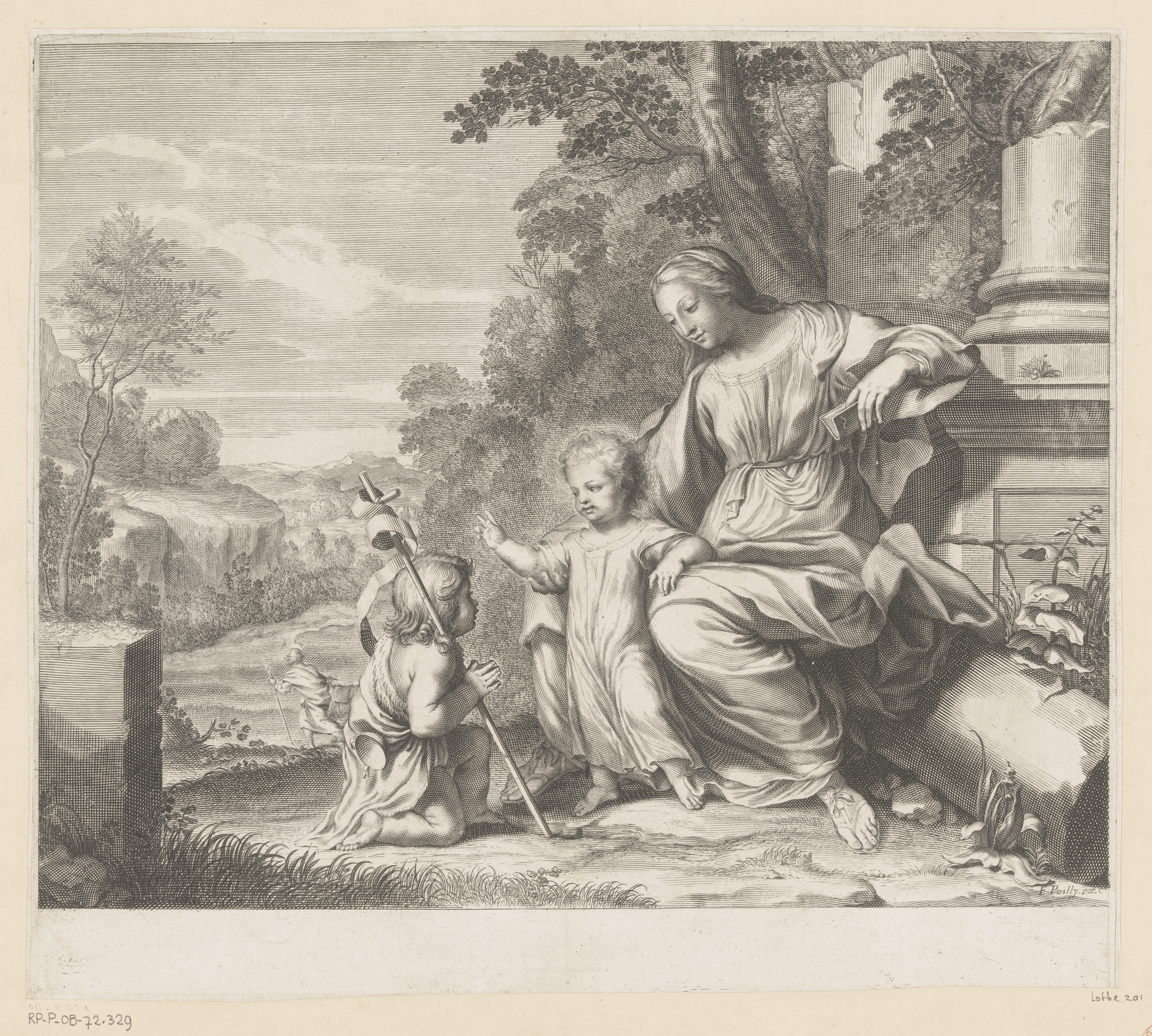 Maria bij ruïne met Christuskind dat de knielende Jo...
