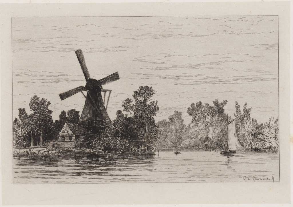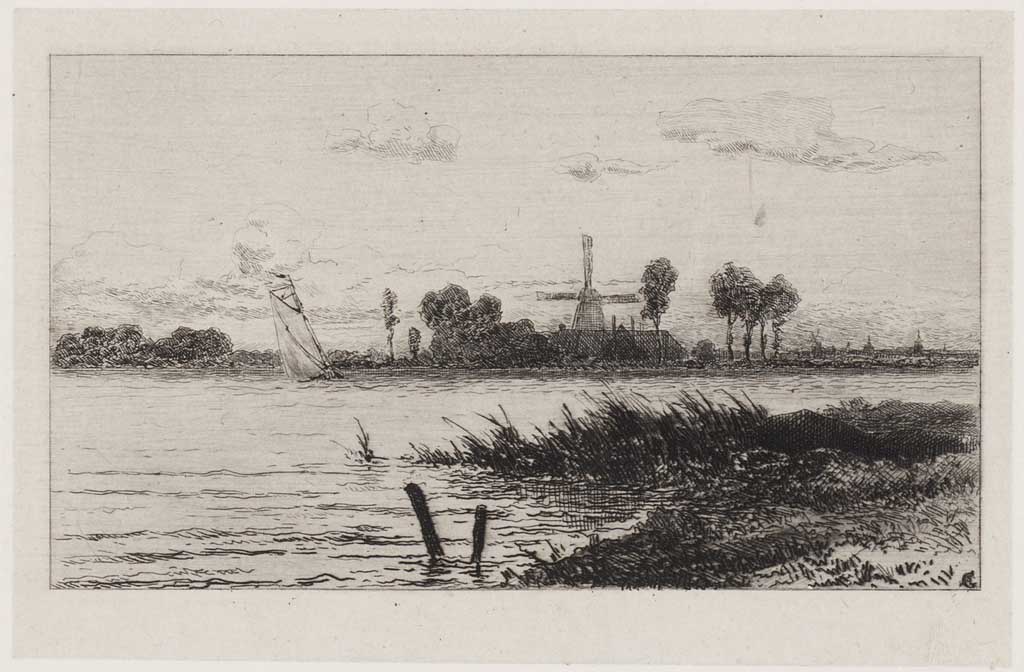 Landschap met molen en zeilboot