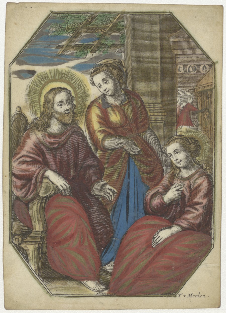 Christus met Martha en Maria, ingekleurd, kz. gebed
