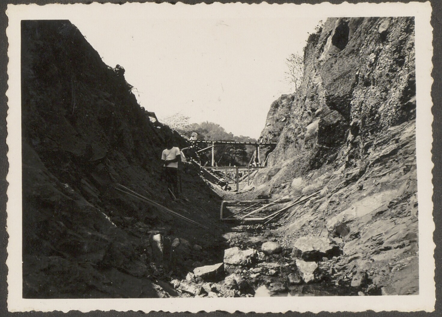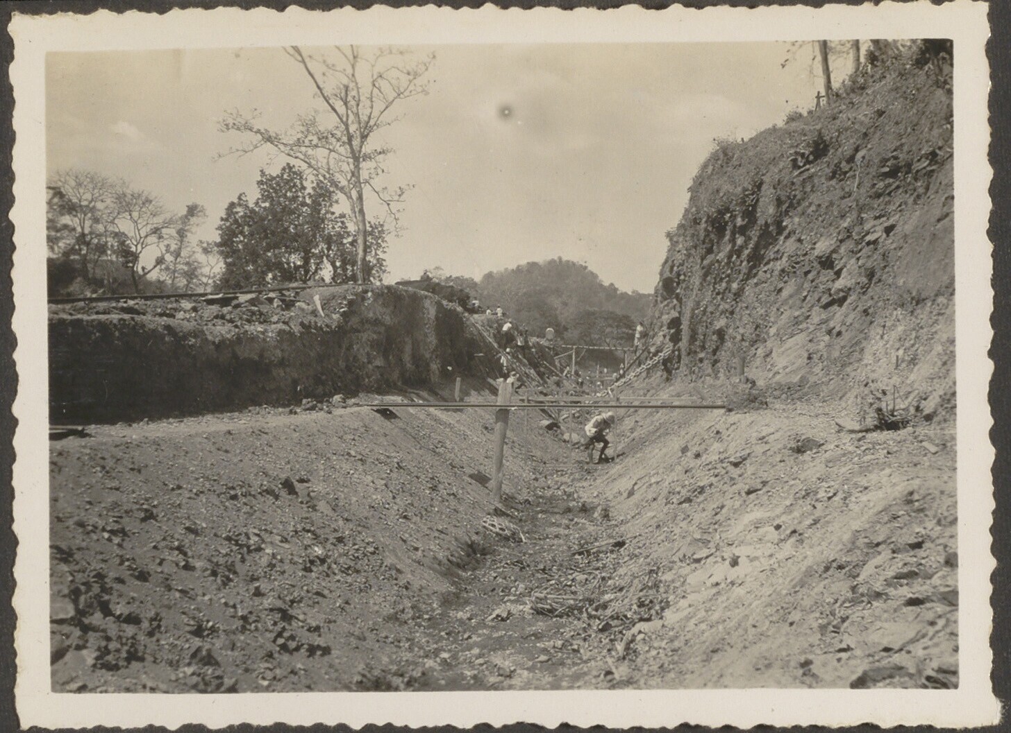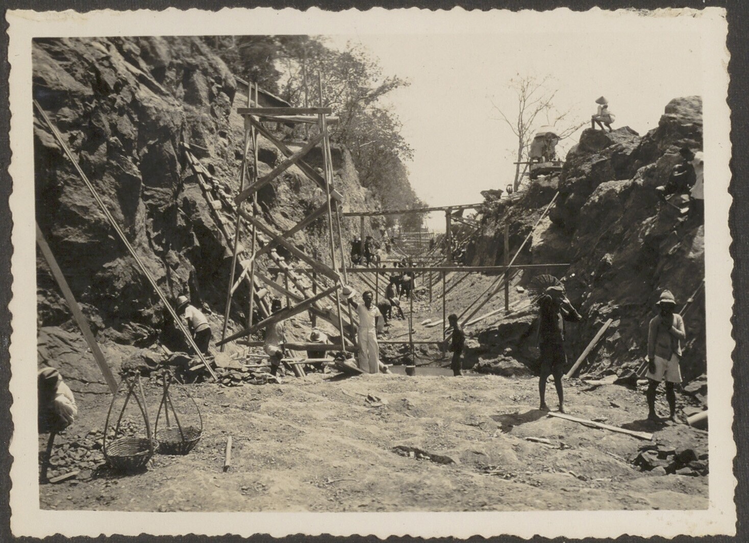 Aanleg van overlaat bij Kratjak door Javaanse arbeiders