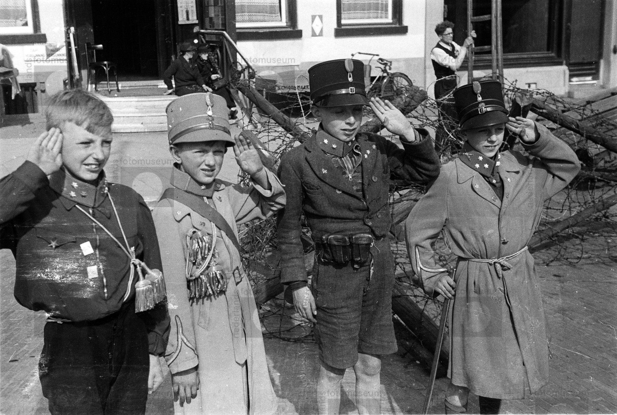 Enkele verklede kinderen, die op straat soldaatje sp...