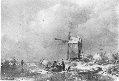 Een molen aan een bevroren rivier, op de voorgrond b...