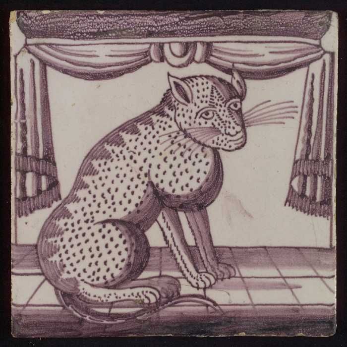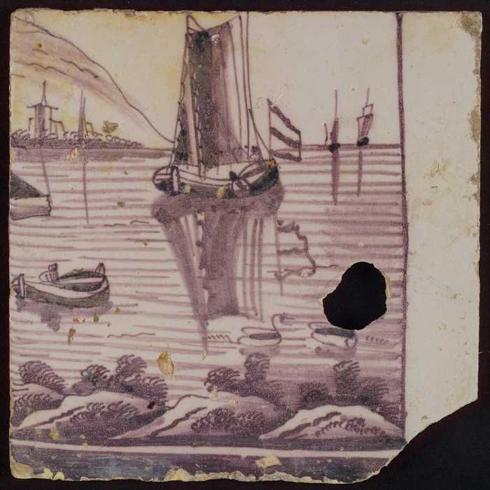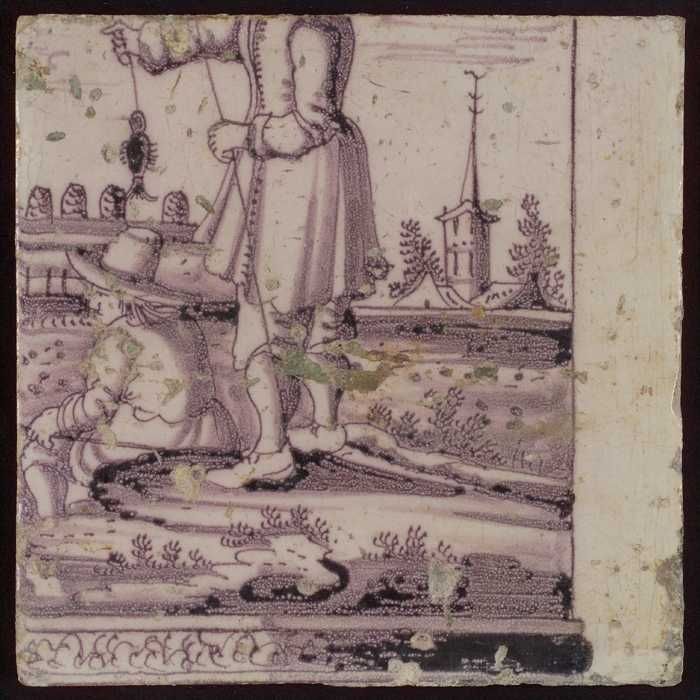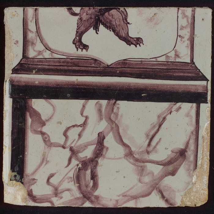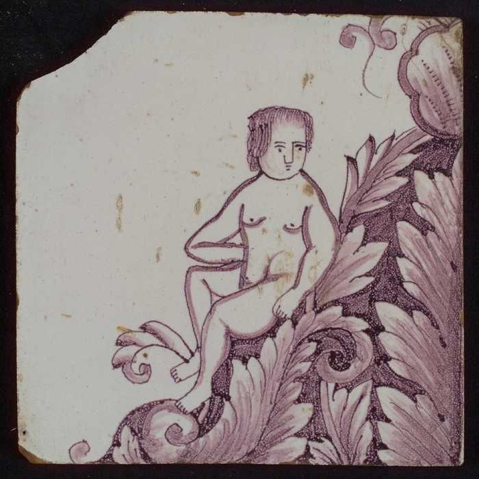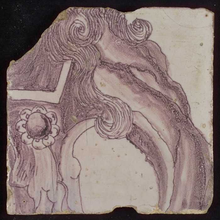 Losse tegel uit pilaster met decor in paars, gelaat ...