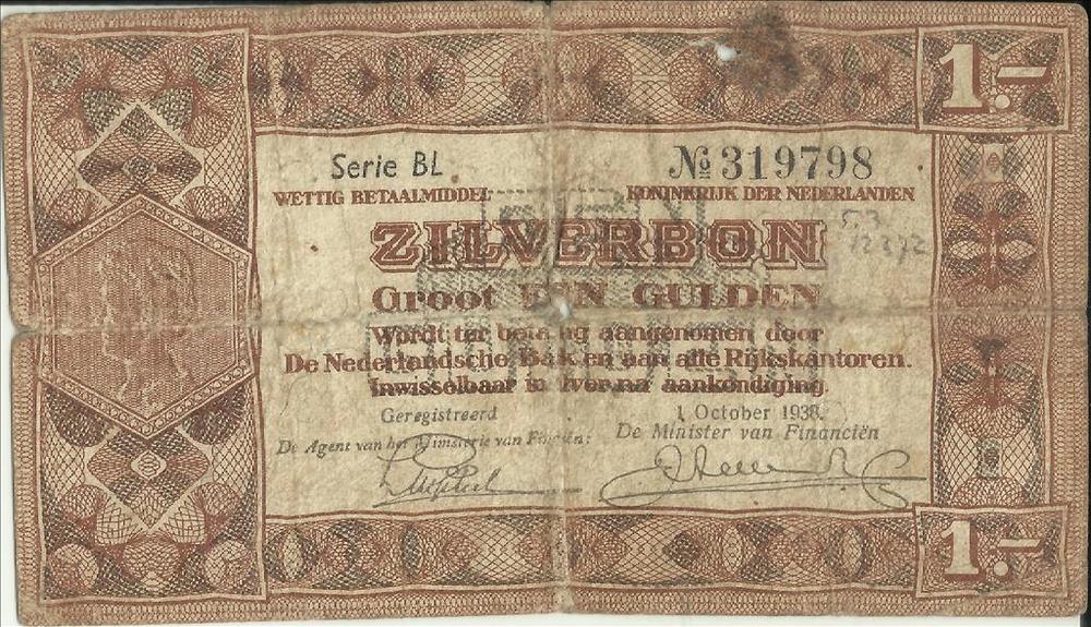 Zilverbon, Nederlands, een gulden, 1938