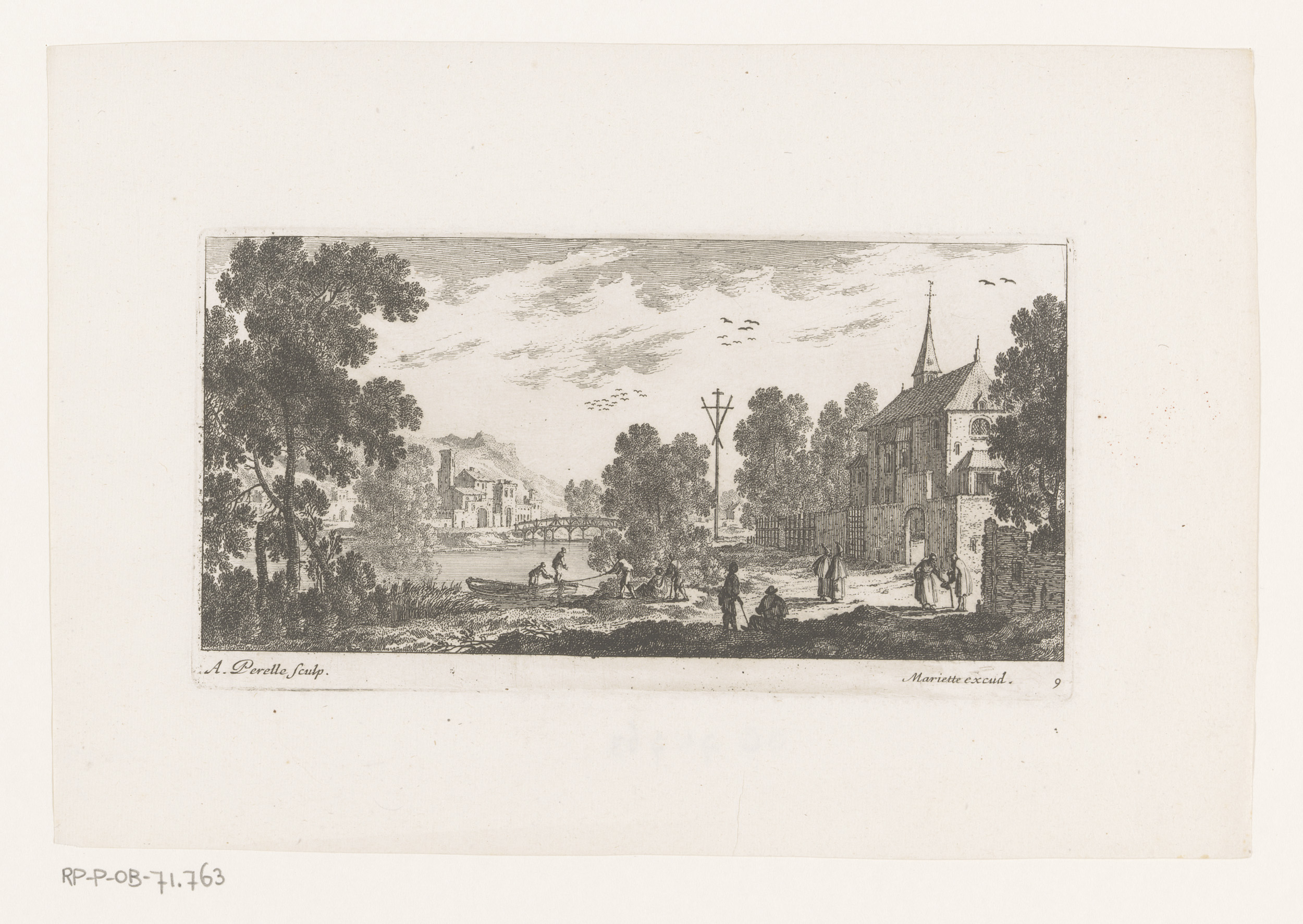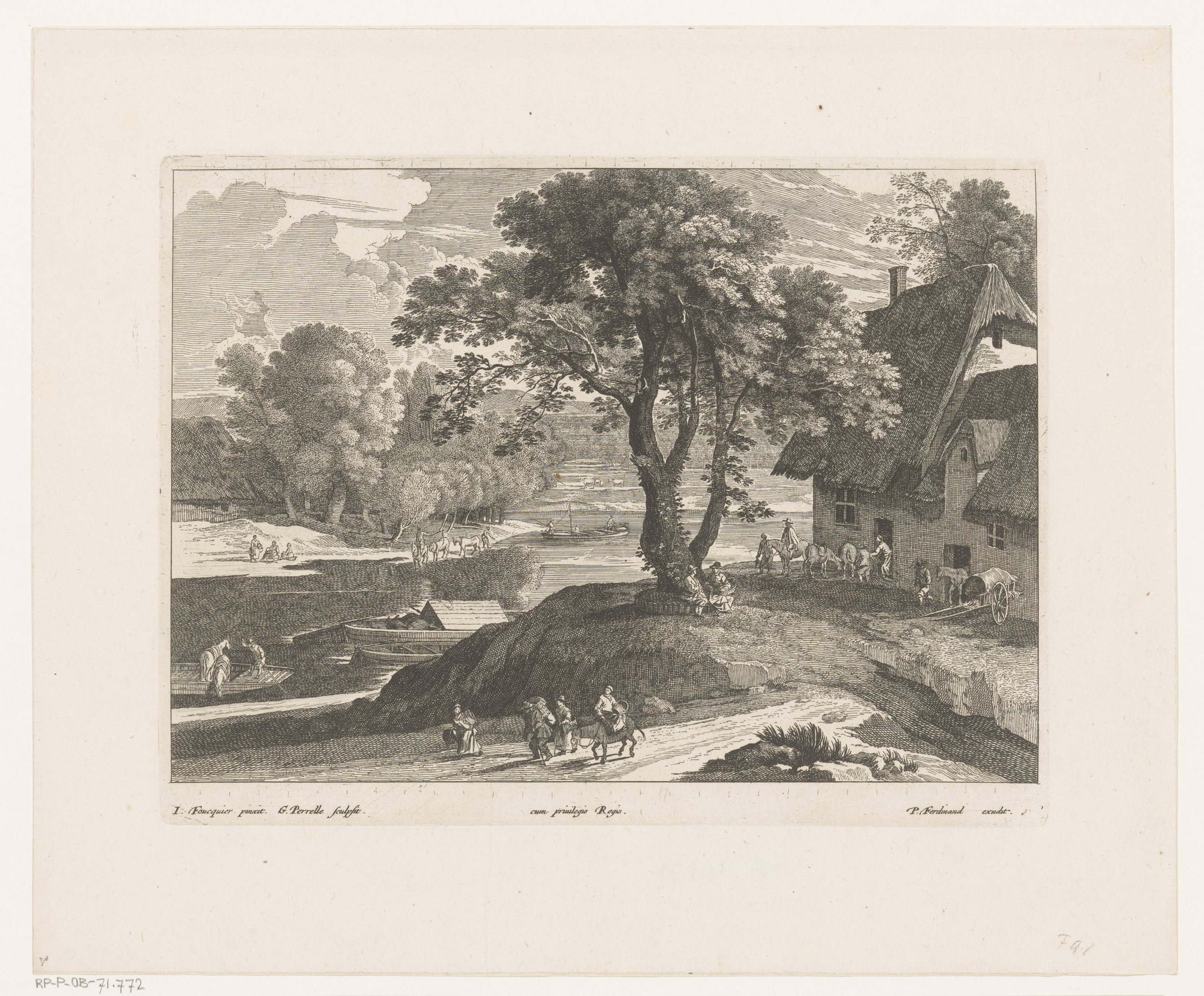 Figuren en lastdieren bij herberg aan rivier