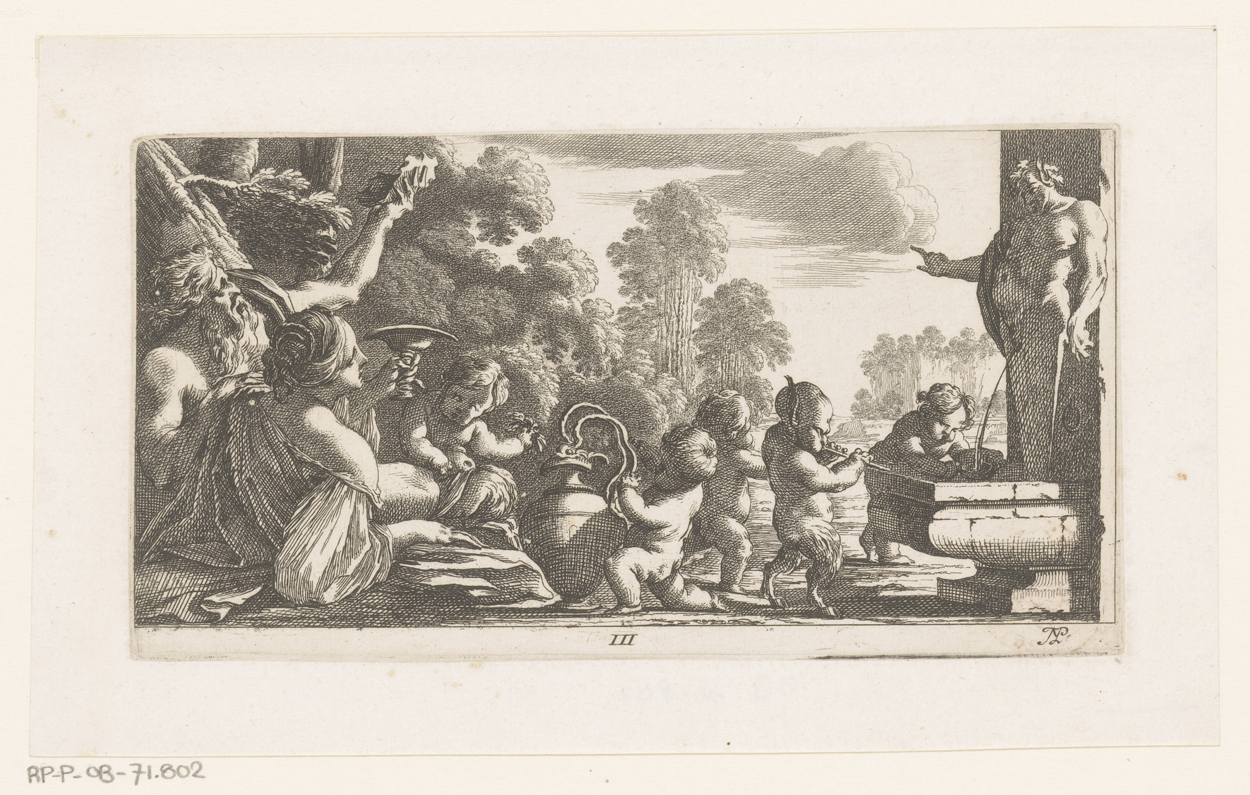 Sater en nimf rustend bij een fontein tijdens de oogst