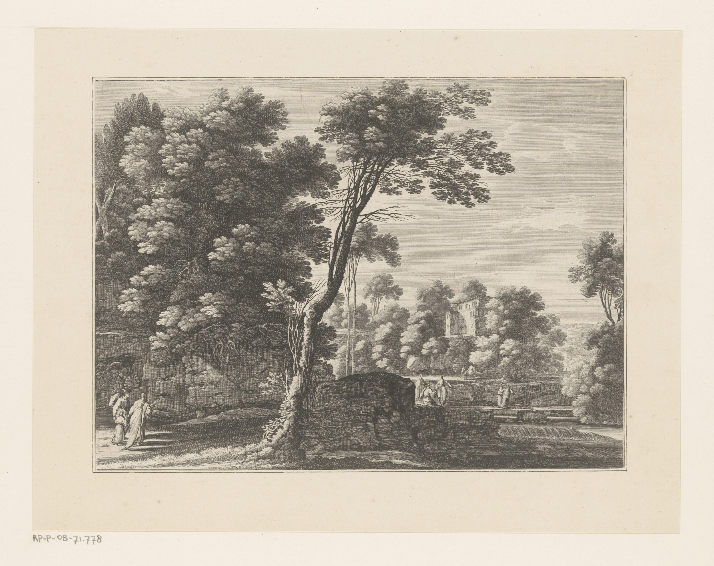 Landschap met figuren drinkend bij fontein