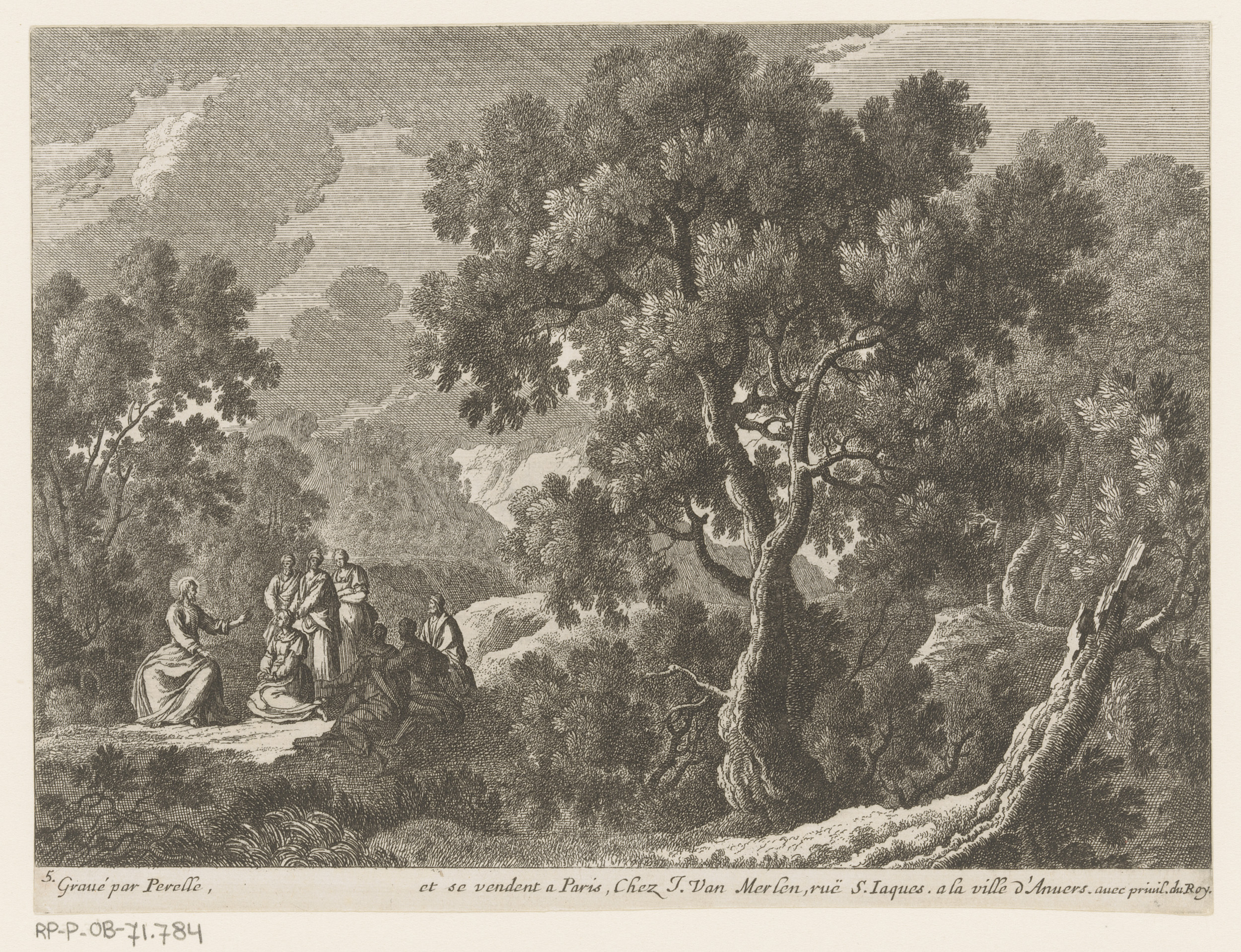 Landschap met Christus predikend voor kleine groep m...