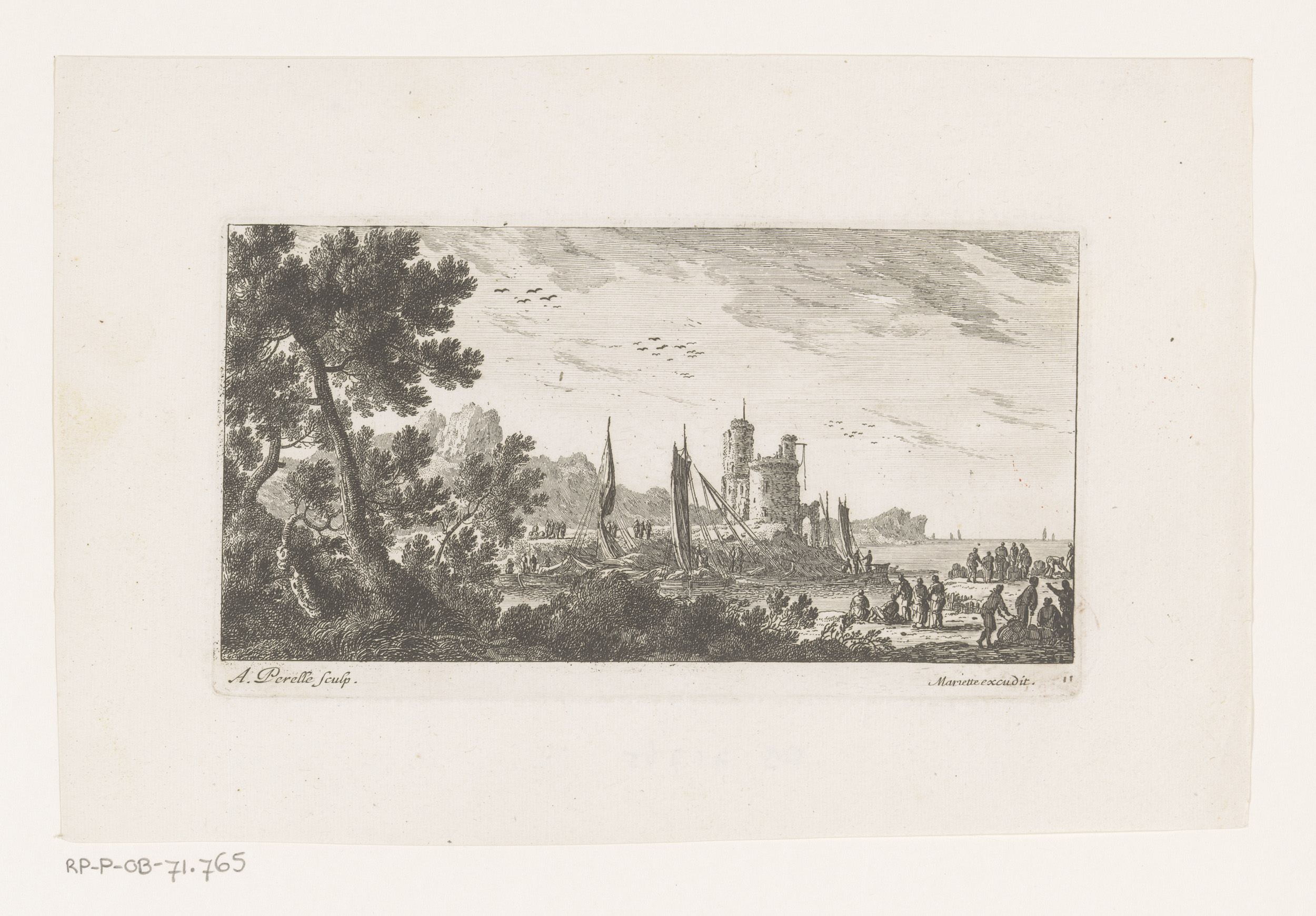 Kustgezicht met boten bij toren
