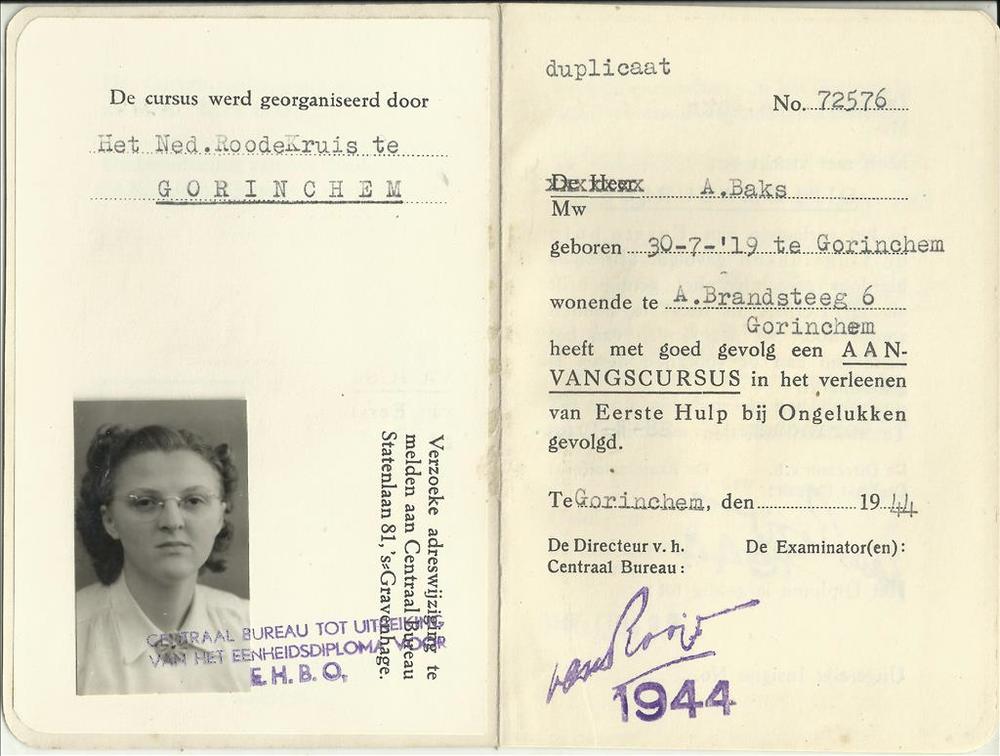 E.H.B.O. eenheids-diploma van A.A. Baks (Eerste Hulp...
