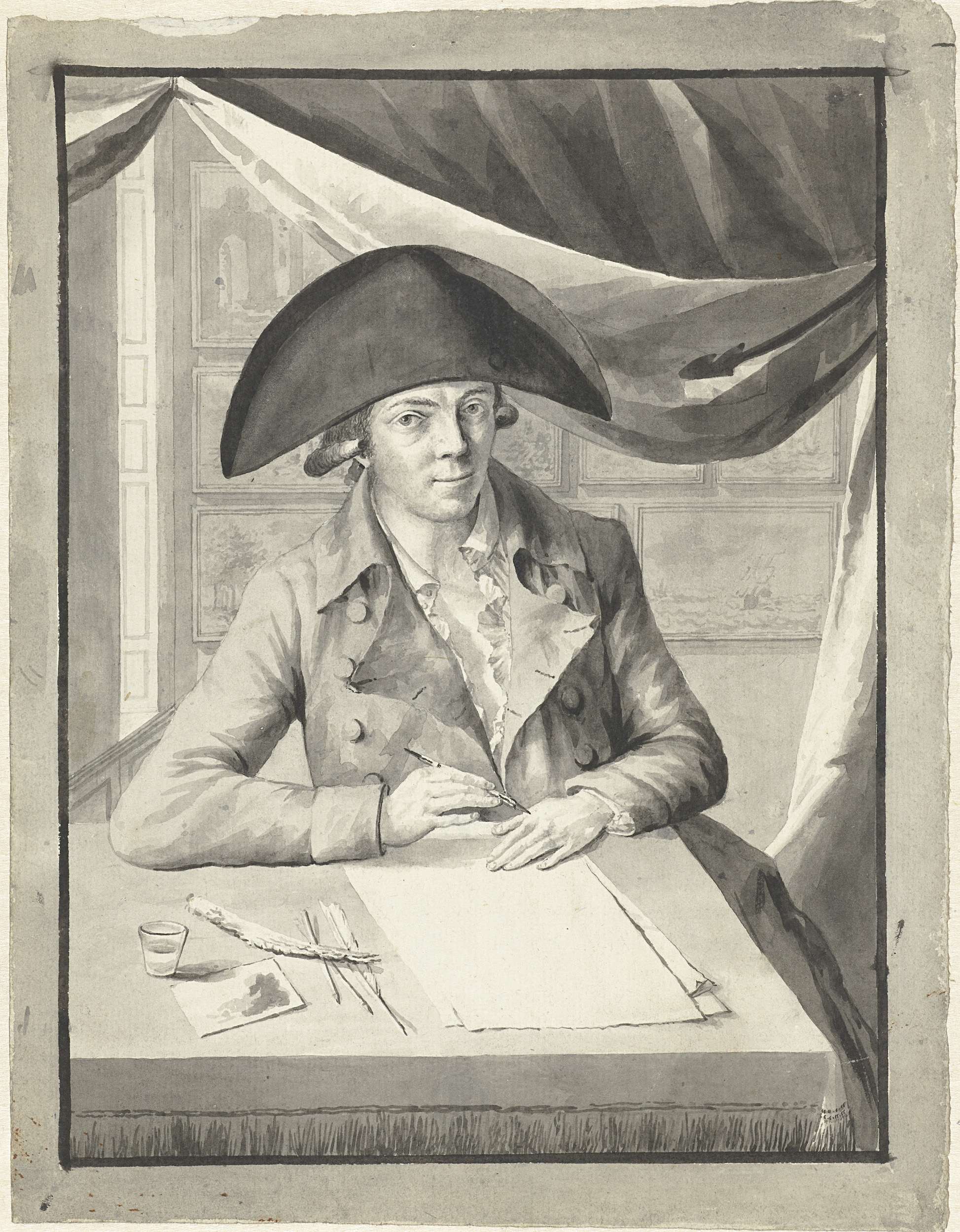 Zelfportret van Hendrik Kuipers, zittend achter een ...