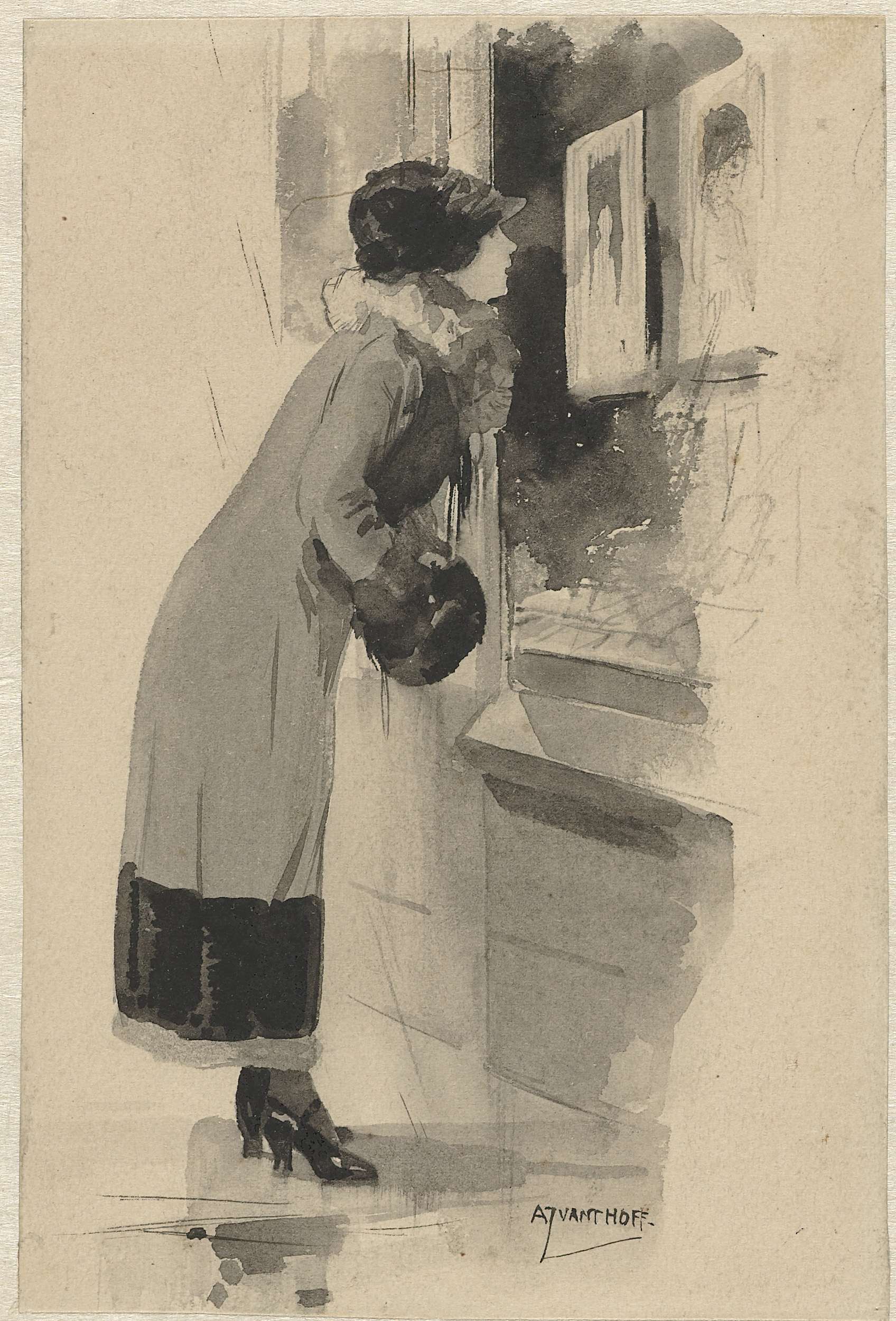 Vrouw voor een etalage met prenten en boeken