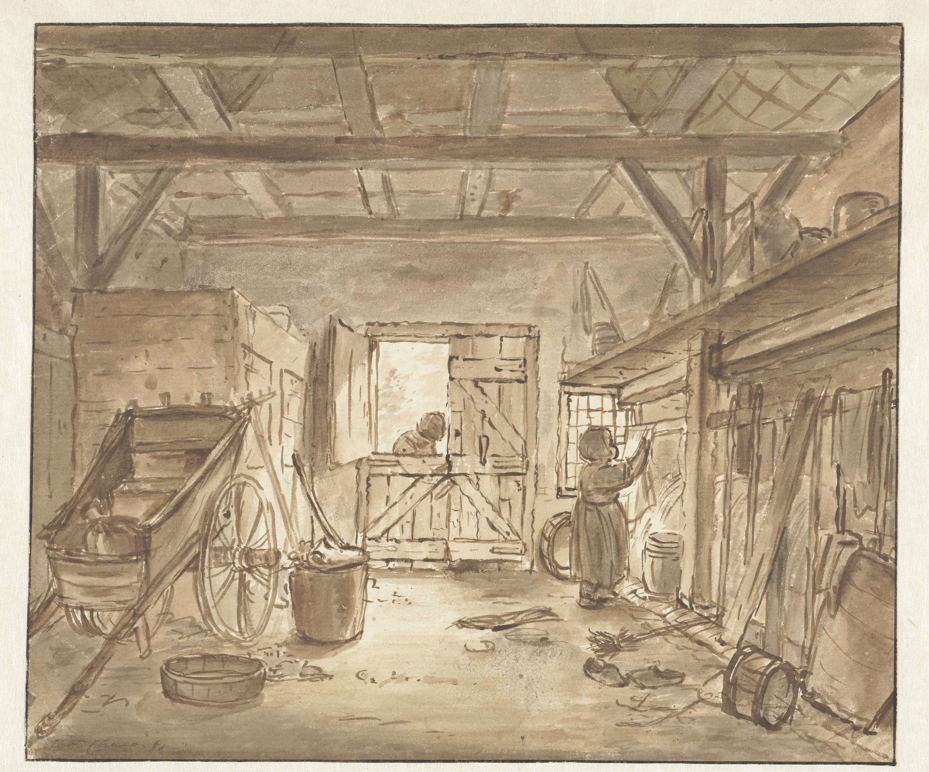 Hoekje van een stal met een meisje dat een doek ophangt