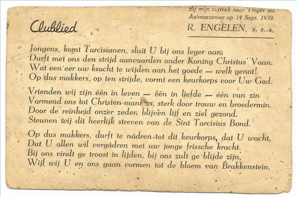 Bidprent aalmoezelier R. Engelen met clublied St Tar...