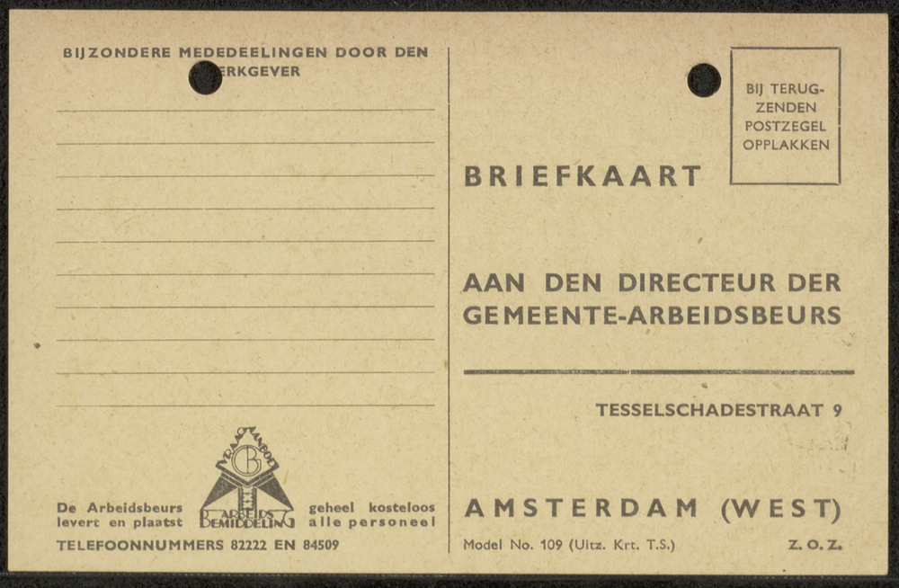 Briekaart van de Gemeente Arbeidsbeurs Amsterdam