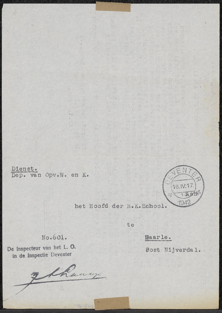 Brief van de Rijksschooltoezicht, inspectie Deventer.