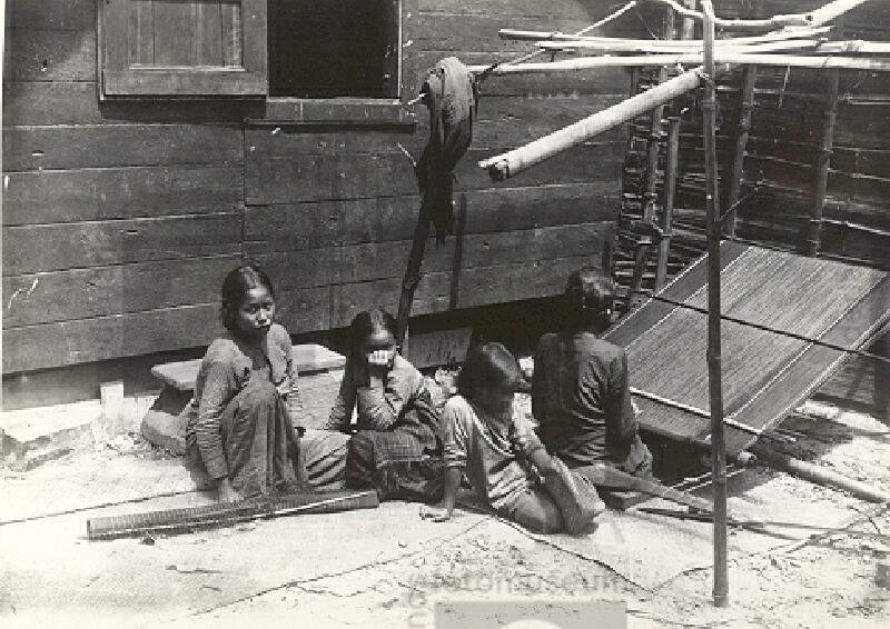 Batak weefster aan weefgetouw, drie meisjes kijken t...