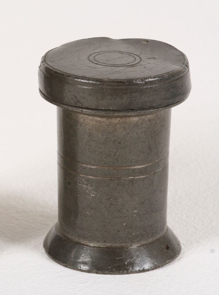 naaldenkoker. Zilveren koker met dop. Op koper vier ...