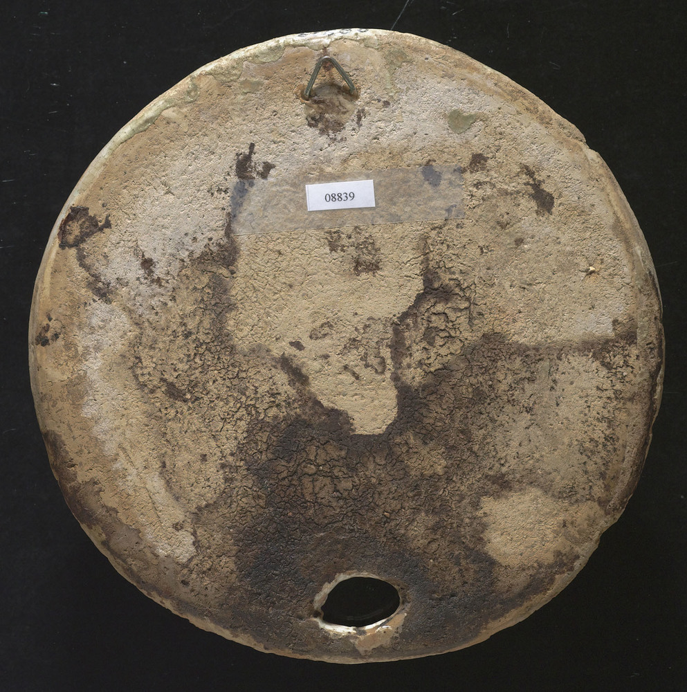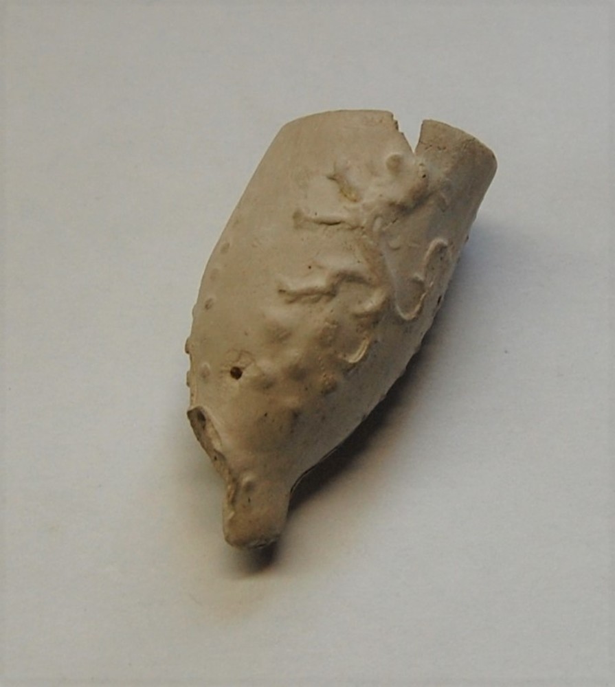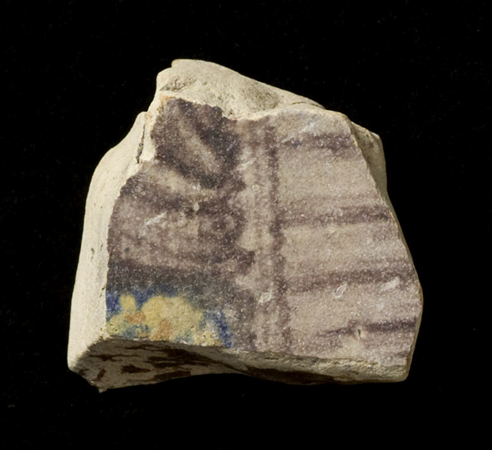 Scherf van keramiek, tinglazuur, voorstellende een c...