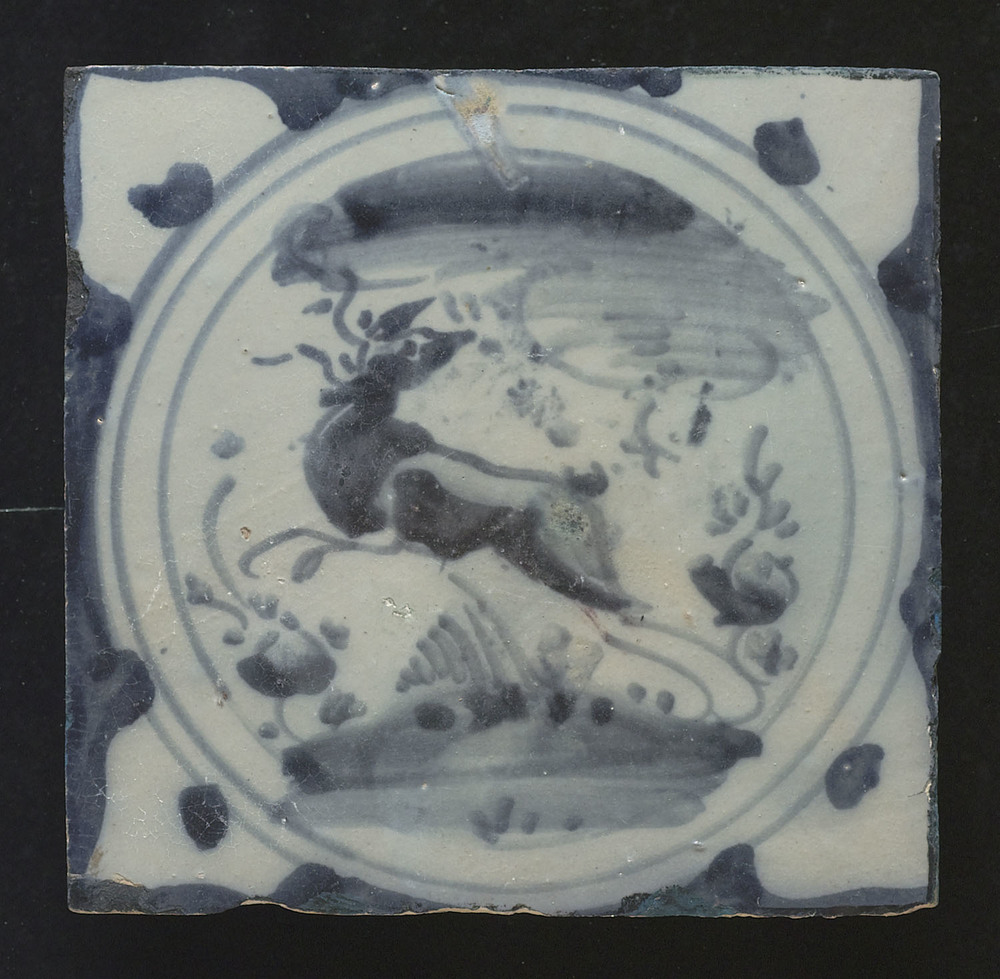Tegel in tinglazuur, voorstellende springend hert, v...