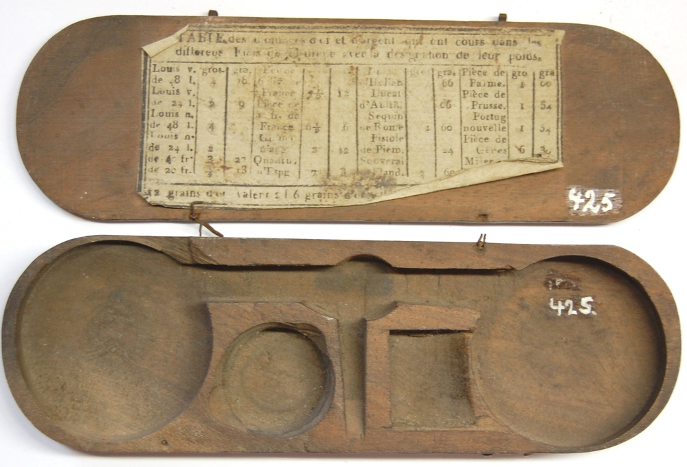 muntweegdoos (lege) van hout met papier in Franse ta...