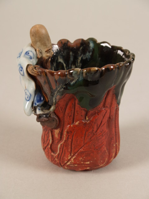 Beker met op de rand een beeld in de vorm van een mo...