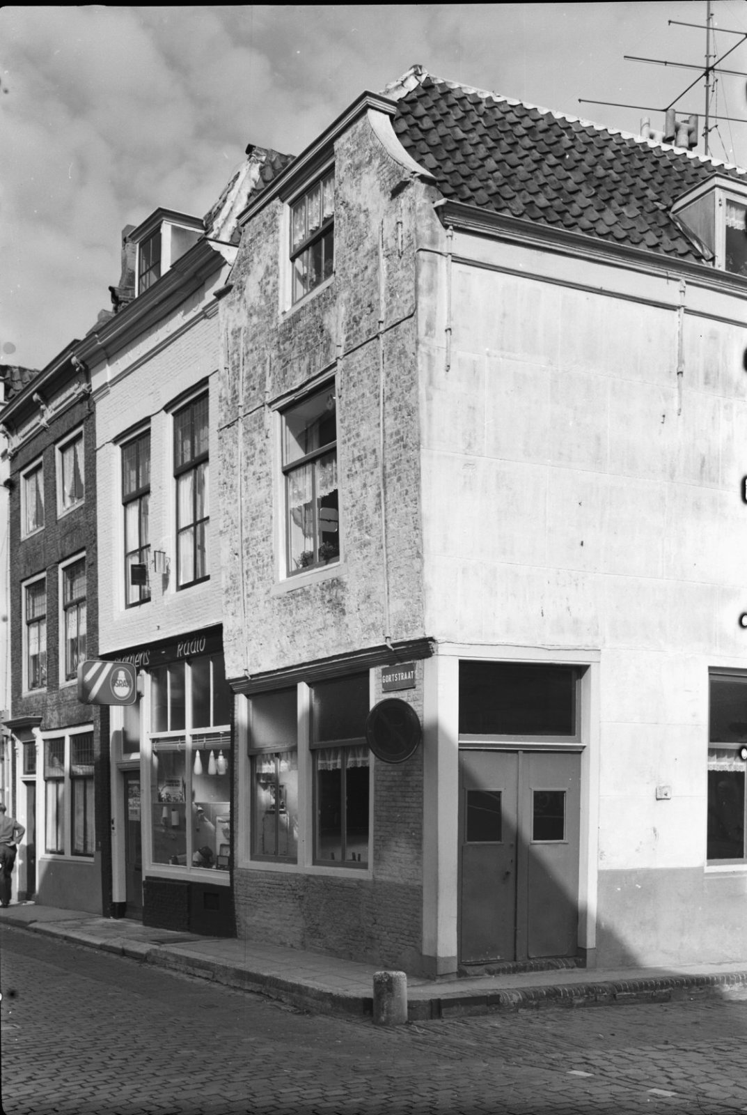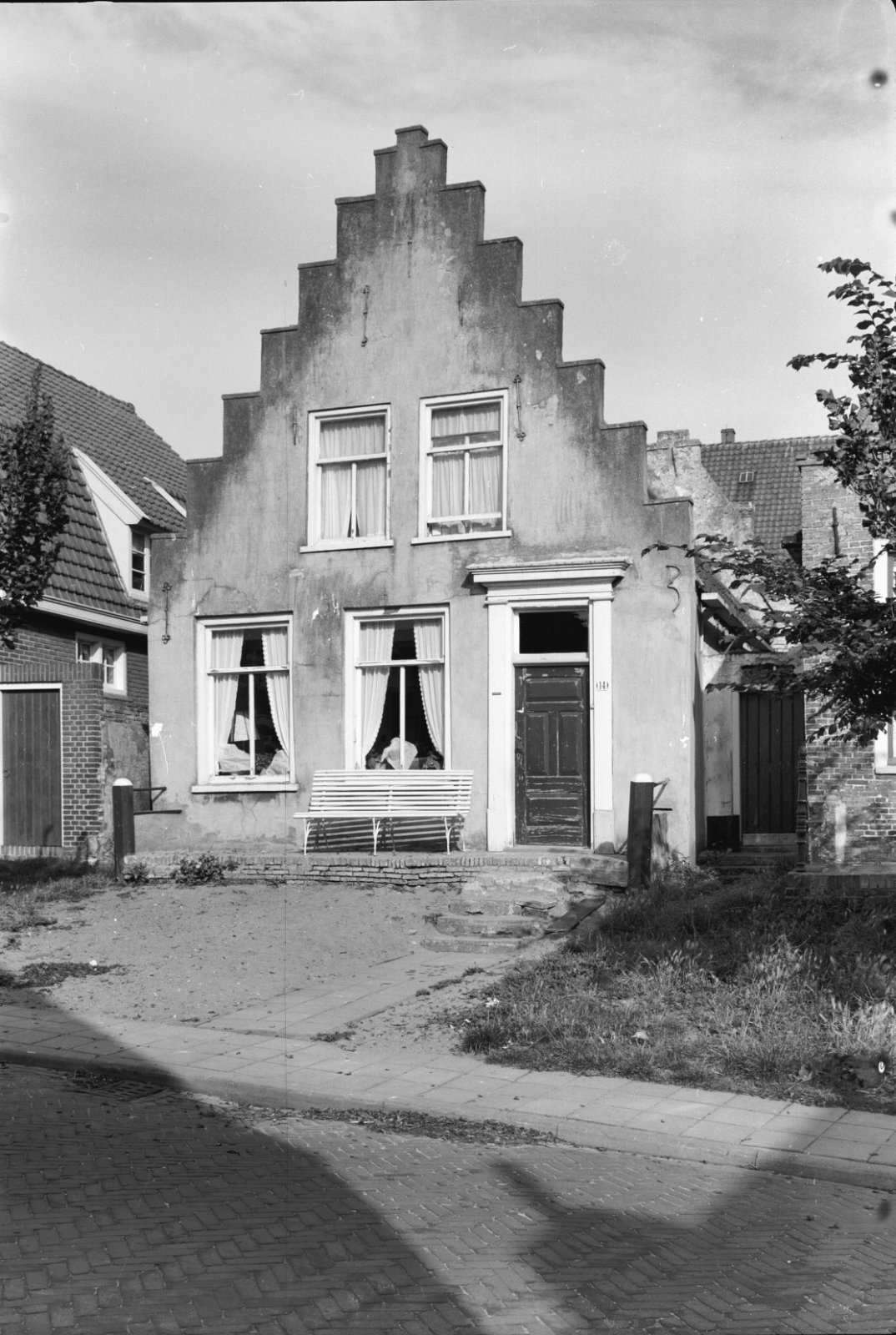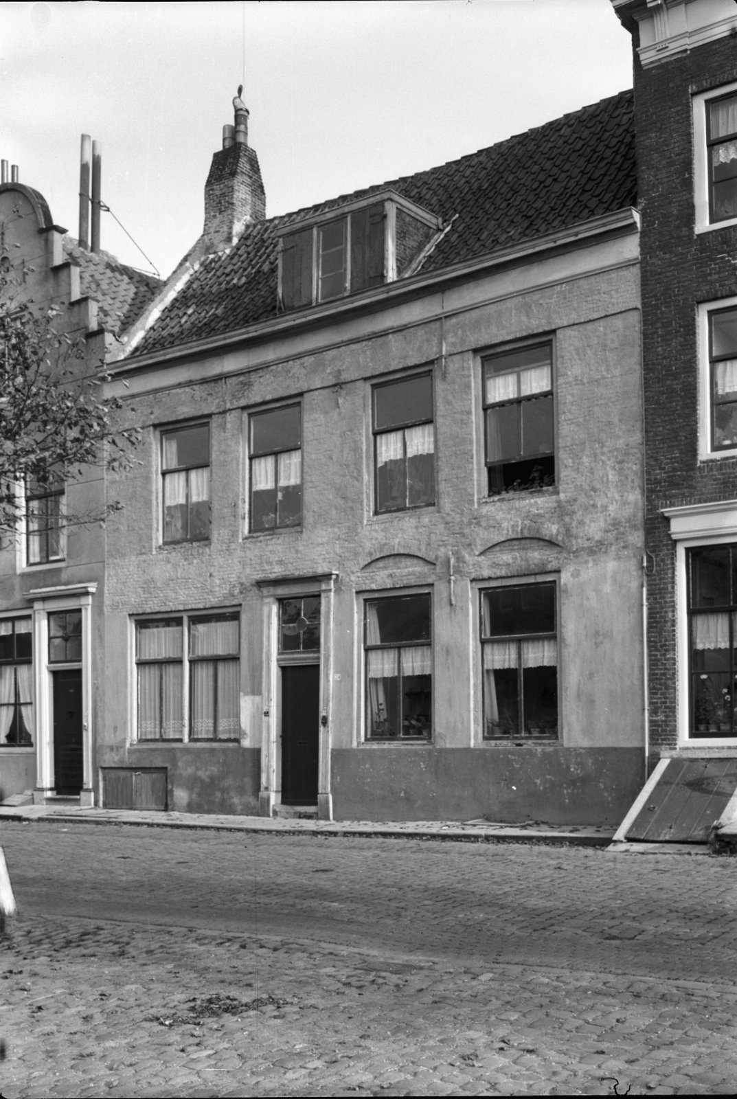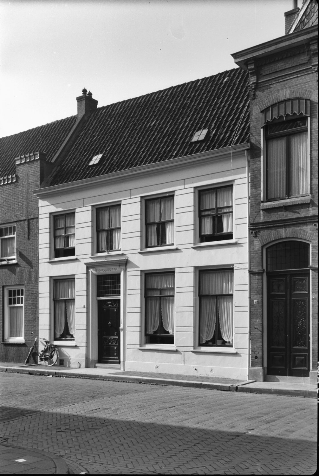 Voorgevel en zijgevel van witgepleisterd pand met ve...