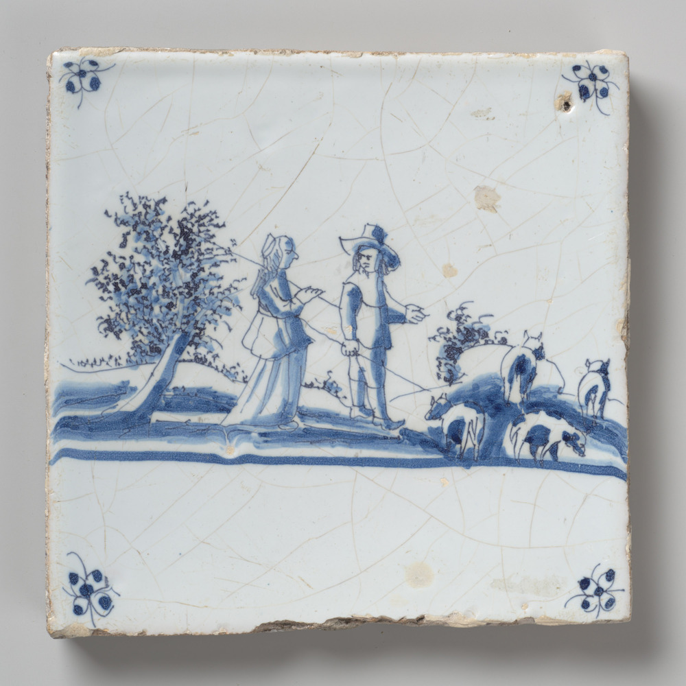 tegel van aardewerk met tinglazuur, voorstellende: h...