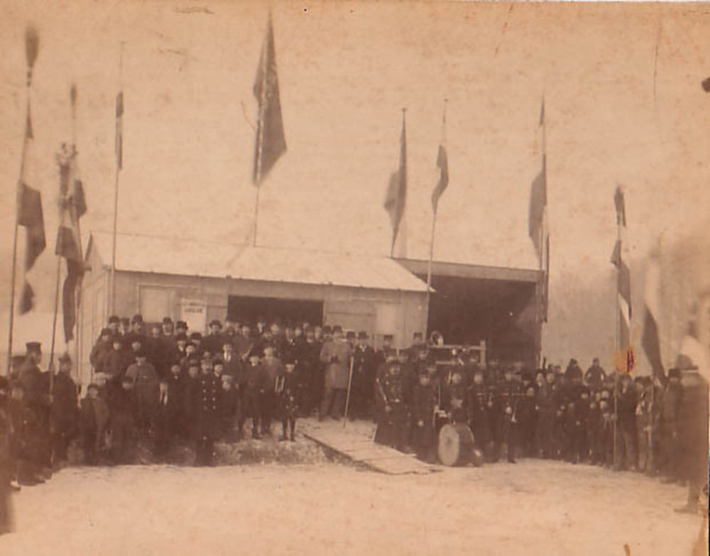Groepsfoto van kermisgangers voor de kapsalon van Sj...