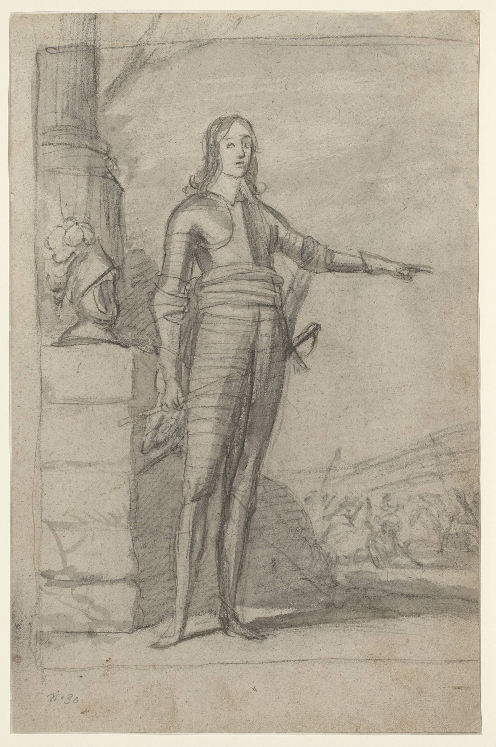 Staande man in harnas met in de achtergrond een veld...