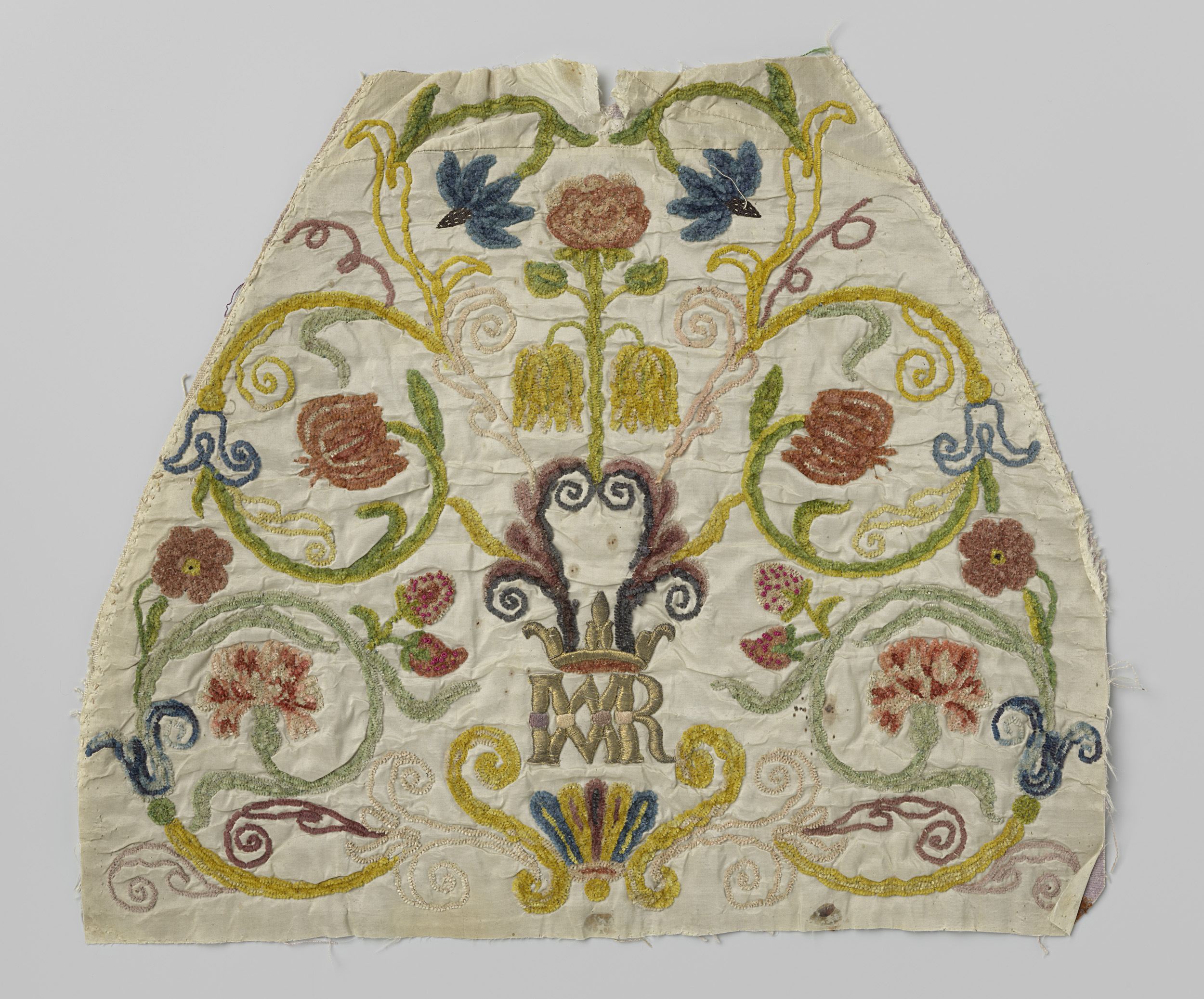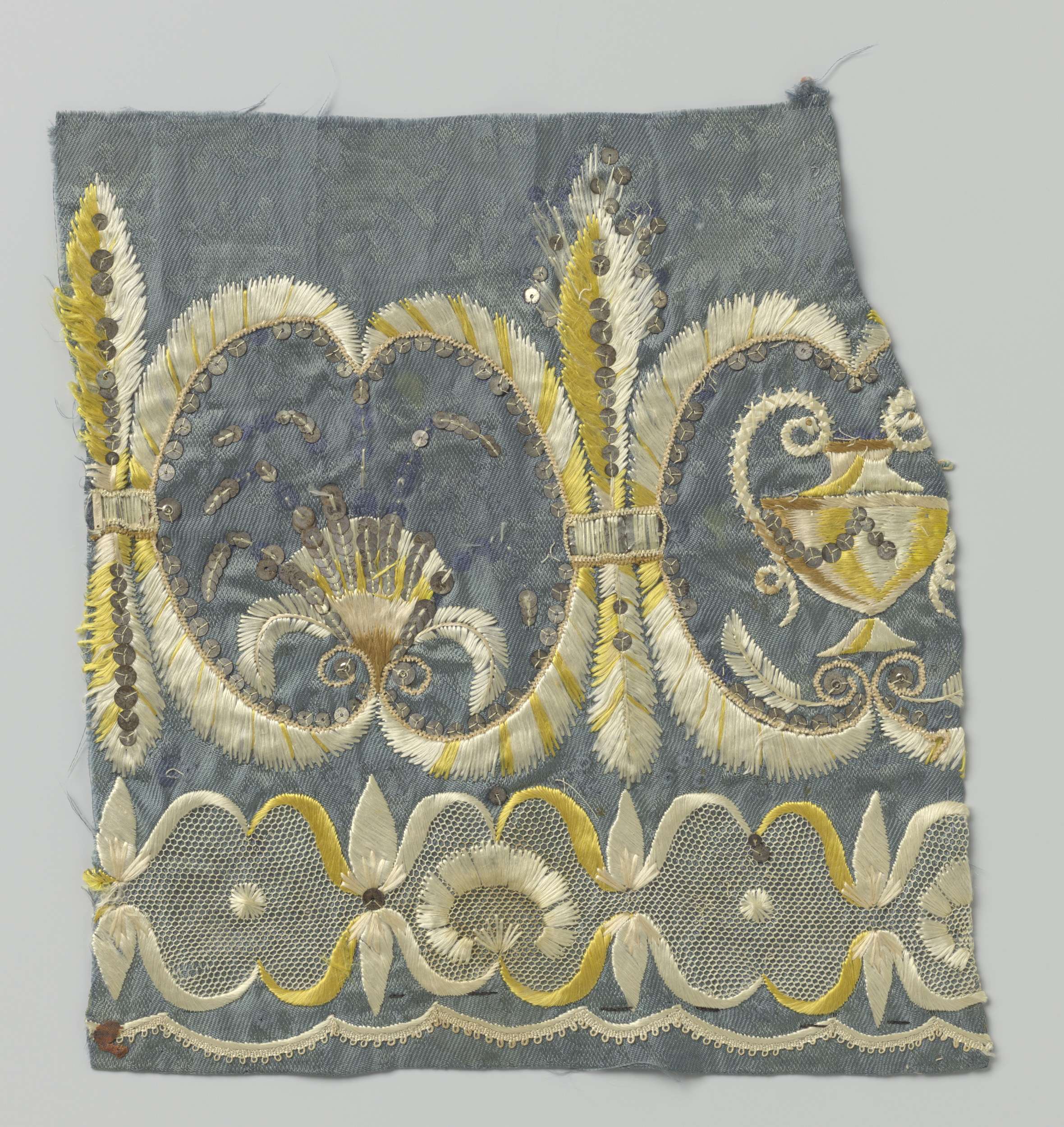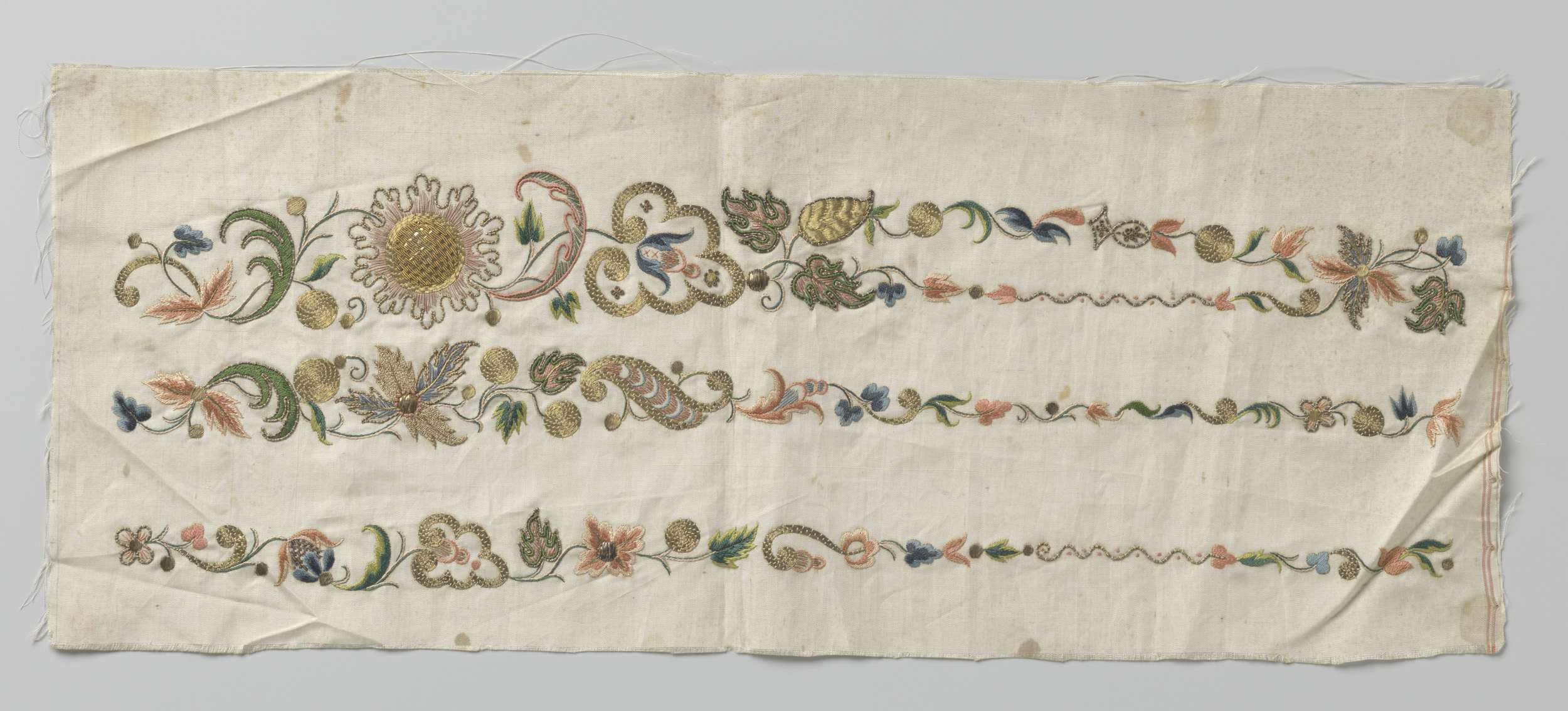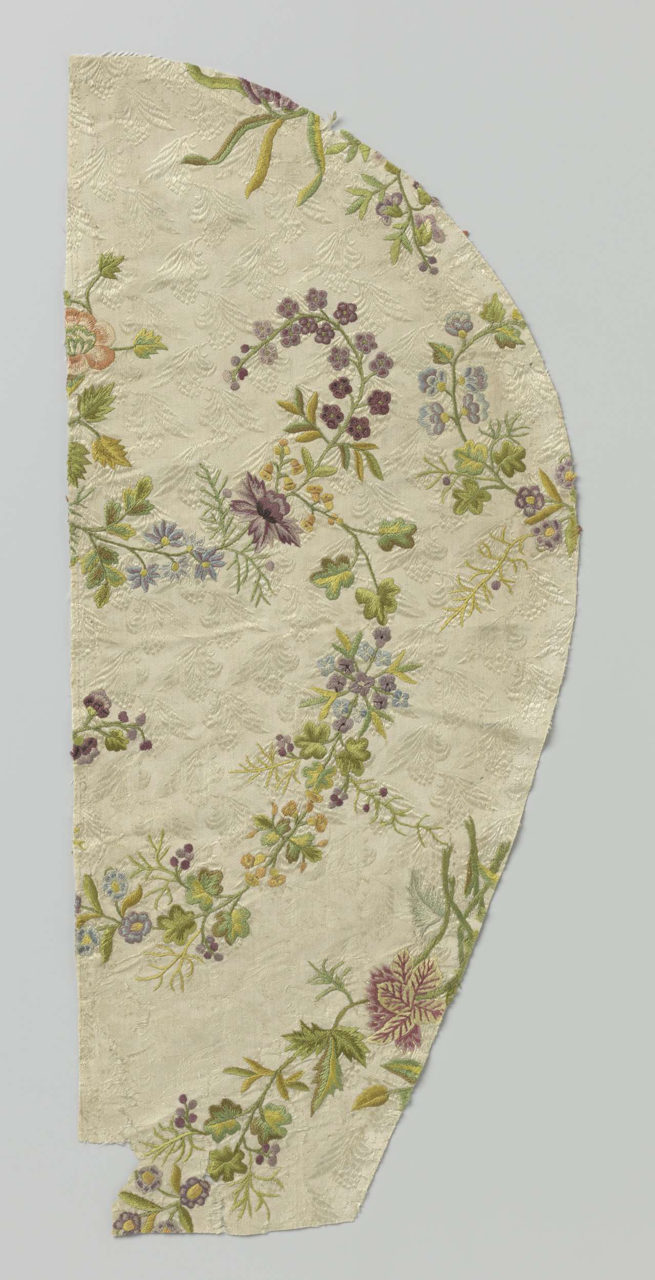 Fragment wit zijdeweefsel met veelkleurig borduurwerk
