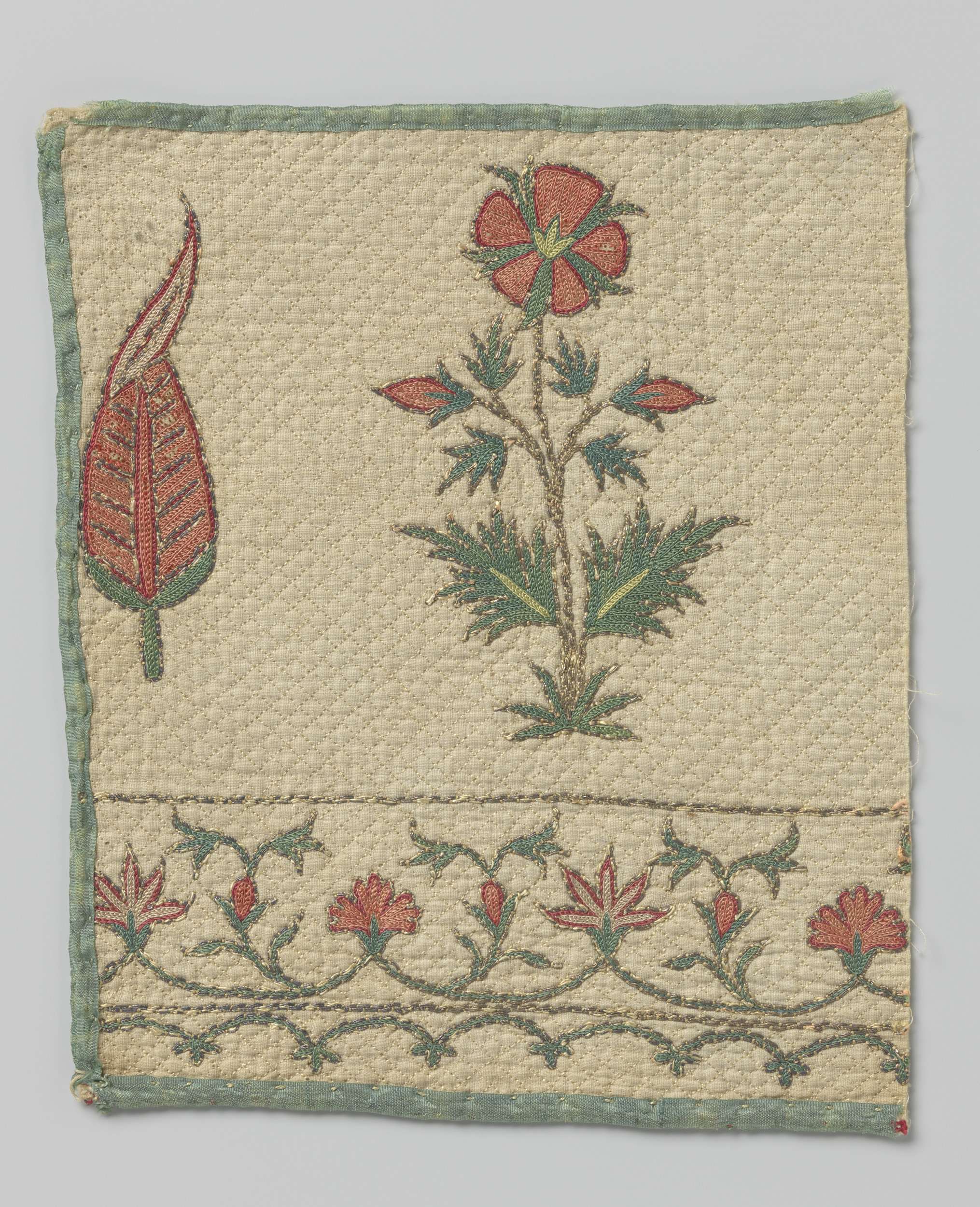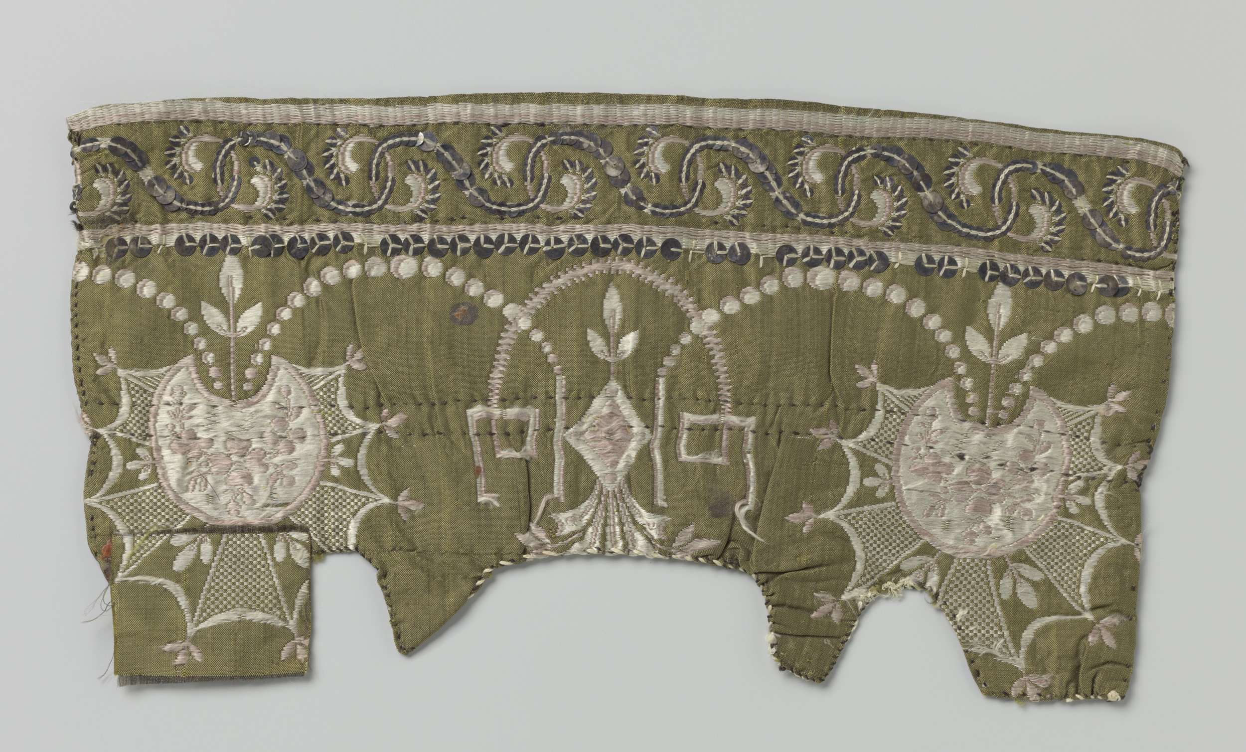 Fragment groen zijdeweefsel met borduurwerk in roze ...