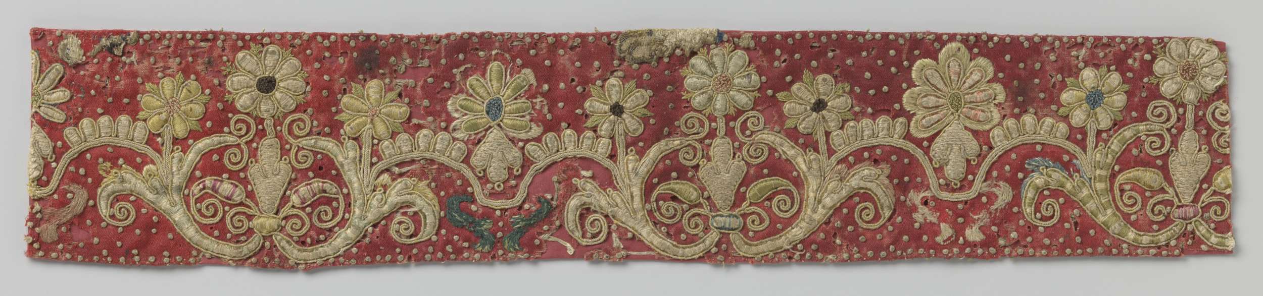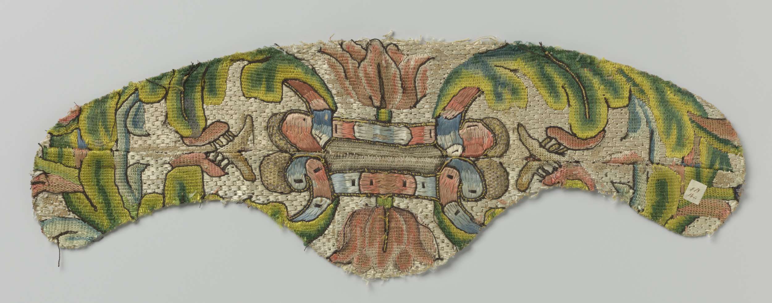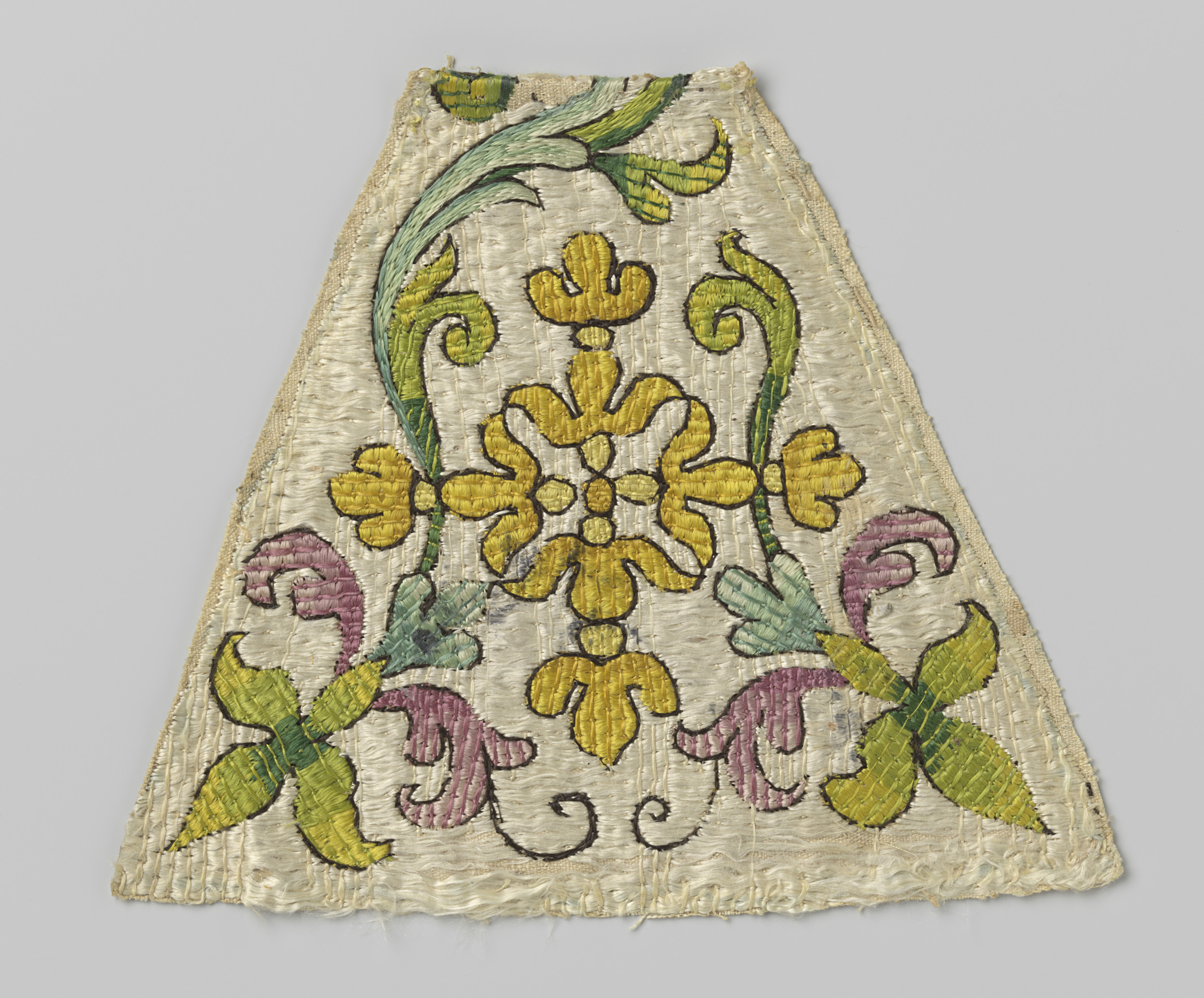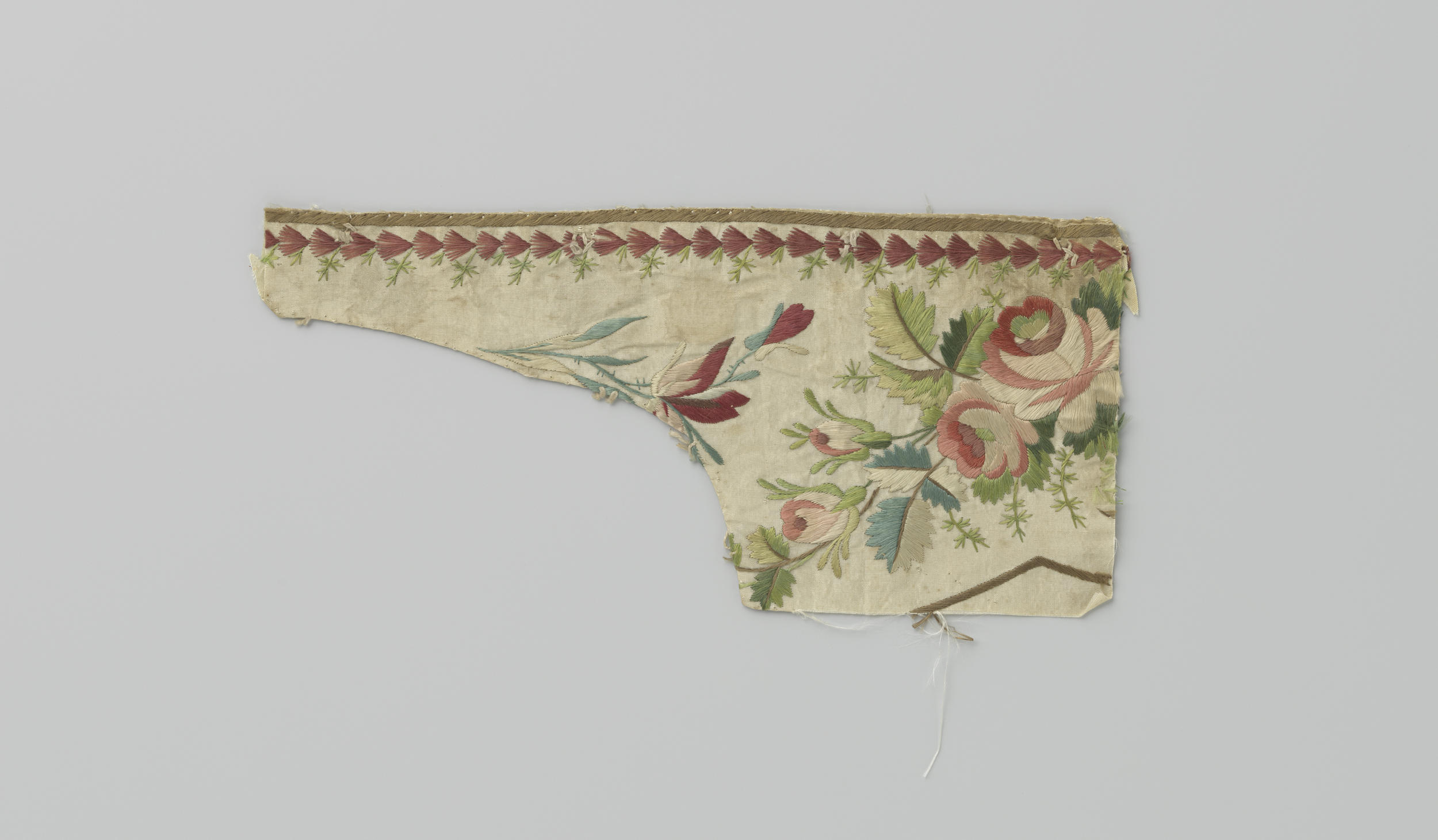 Fragment zijdeweefsel met veelkleurig borduurwerk
