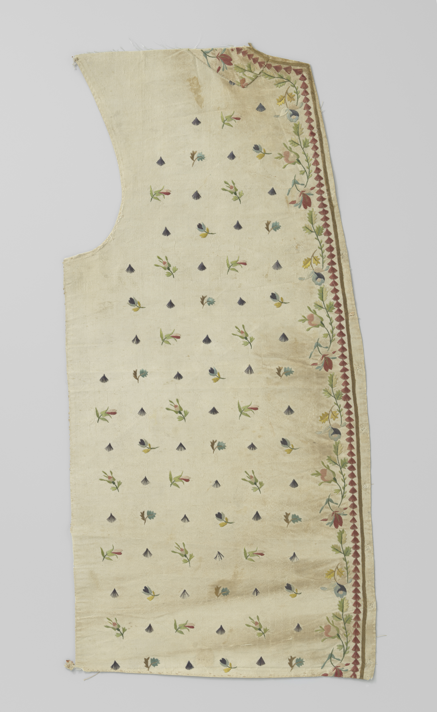 Vest, fragment, van witte zijde met geborduurde bloemen