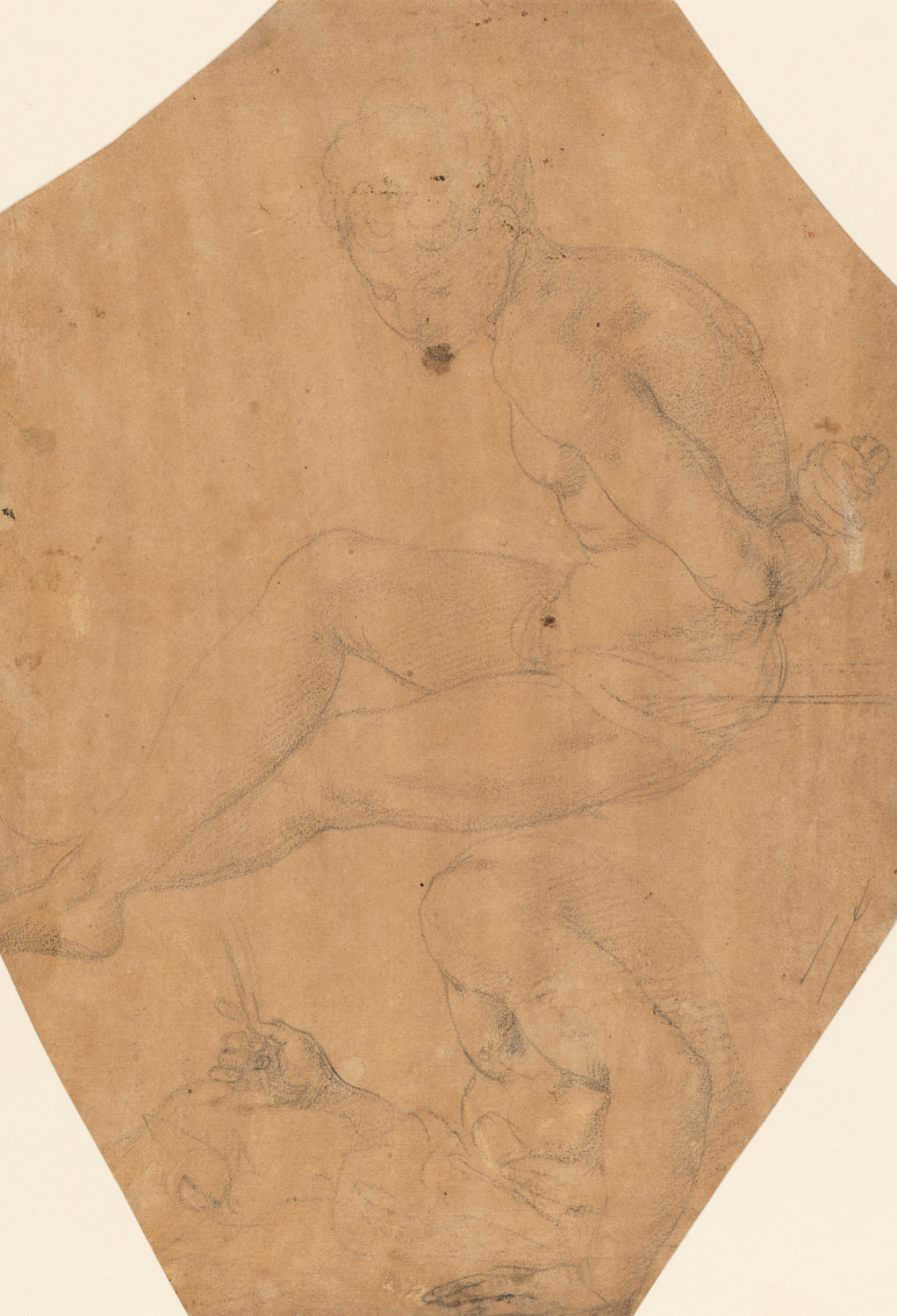 Twee studies van een zittende, naakte jongeman, waar...