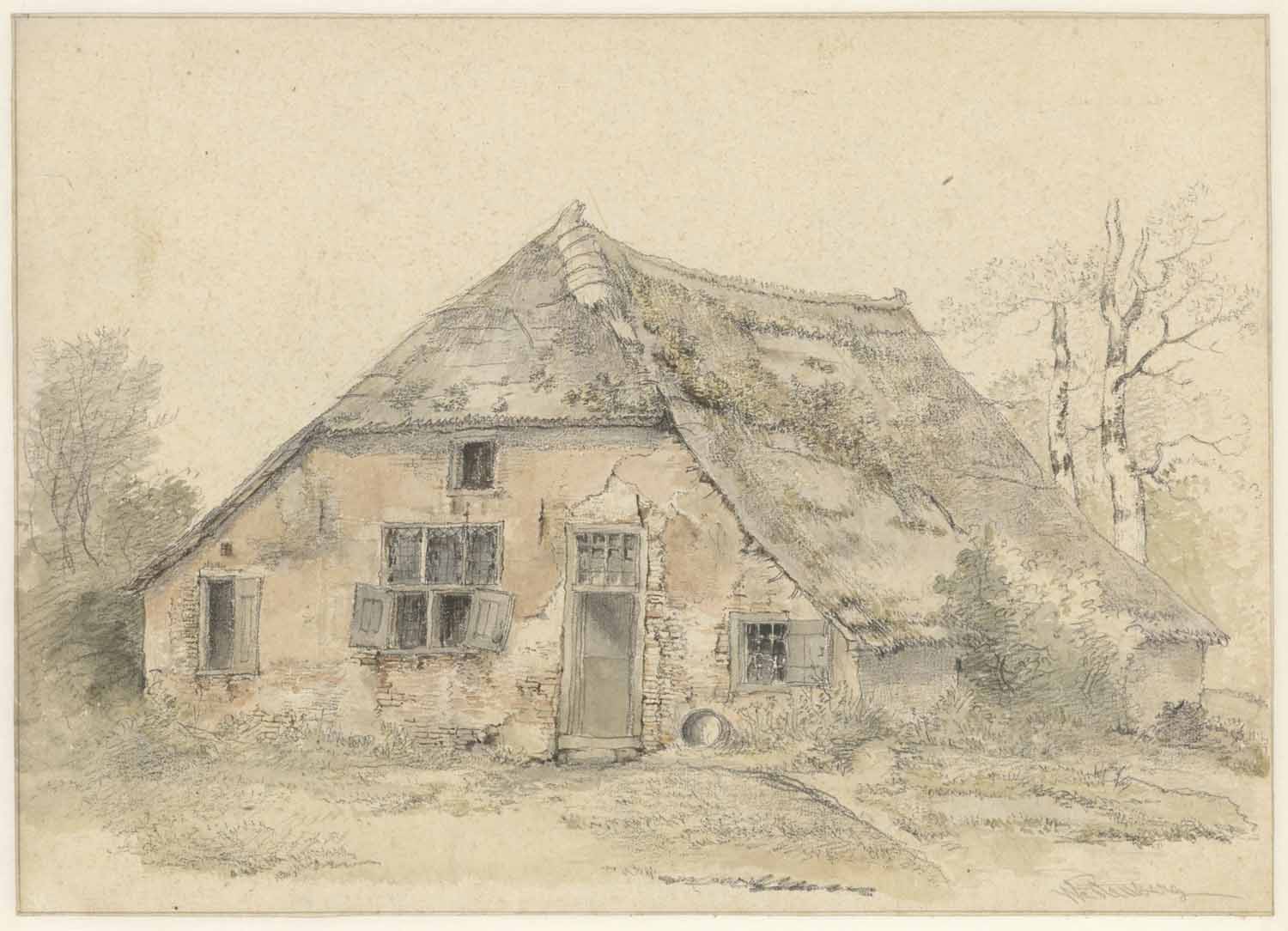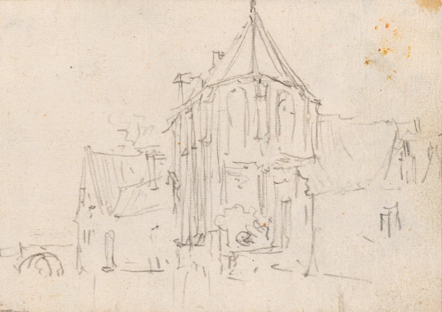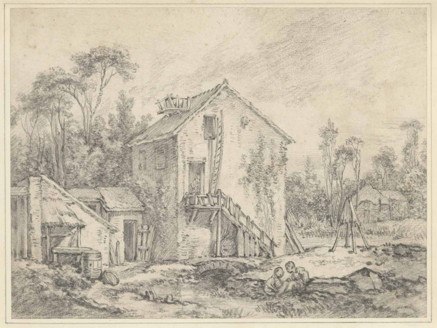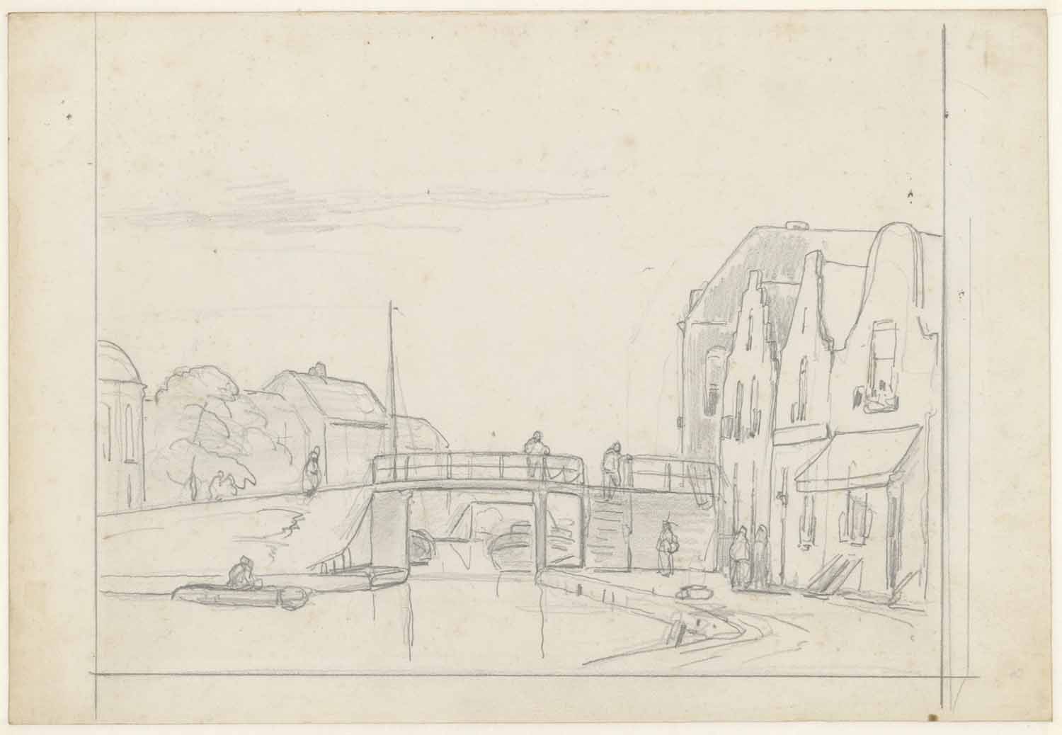 Studieblad met een tuinpoort met brug en een teekena...