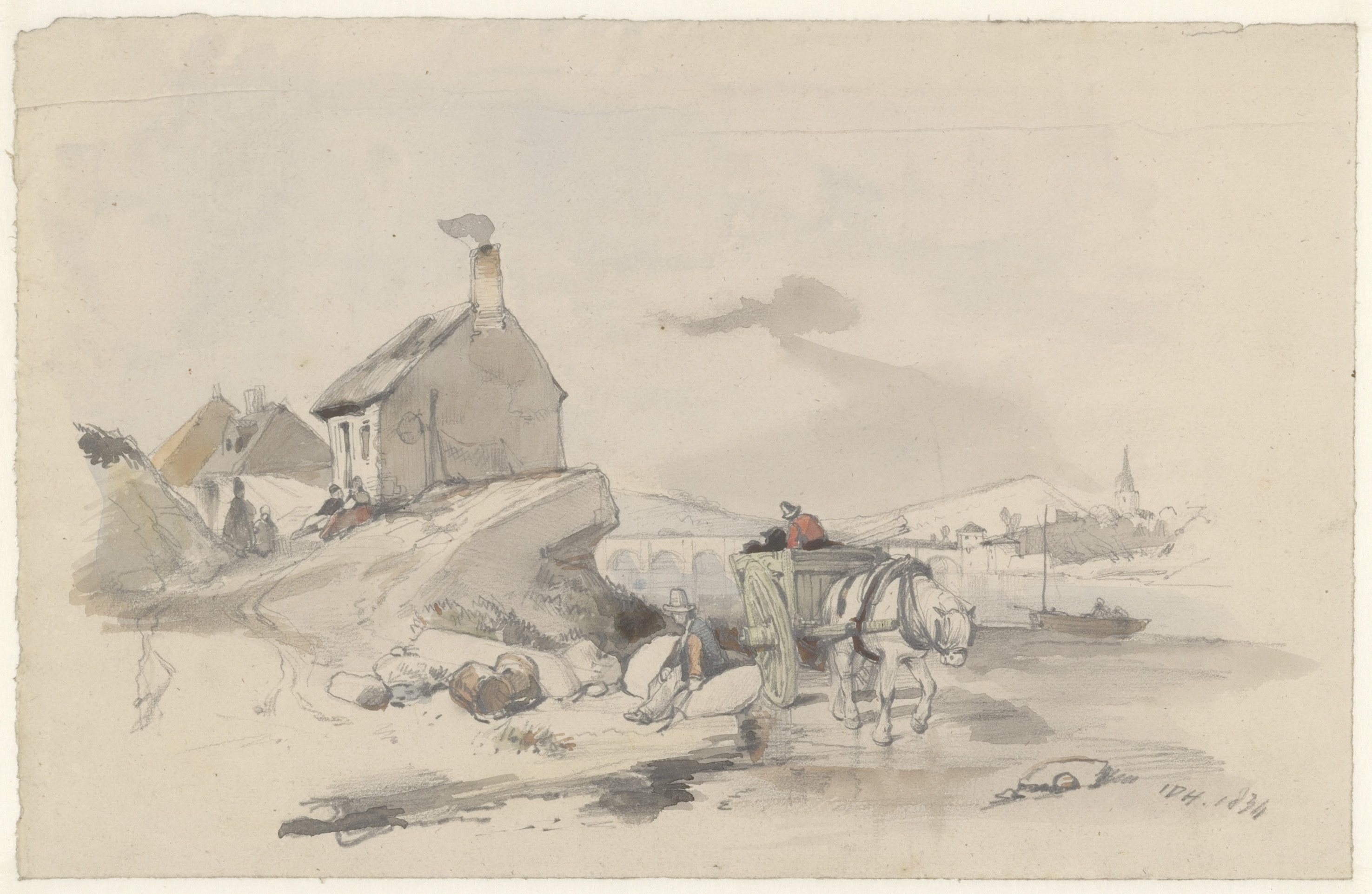 Studieblad met riviergezicht en rivier met koepel en...